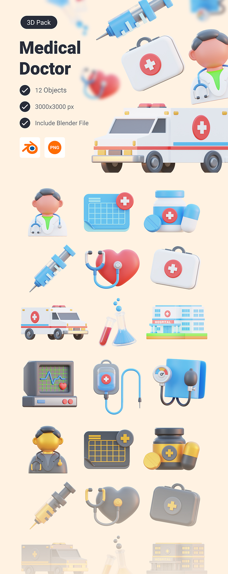 医疗医院3D立体icon救护车医生针筒等blend图标矢量图形素材 声明:本站所有资源版权均属于原作者所有,这里所提供资源均只能用于参考学习用,请勿直接商用。若由于商用引起版权纠纷,一切责任均由使用者承担。更多说明请参考 VIP介绍。