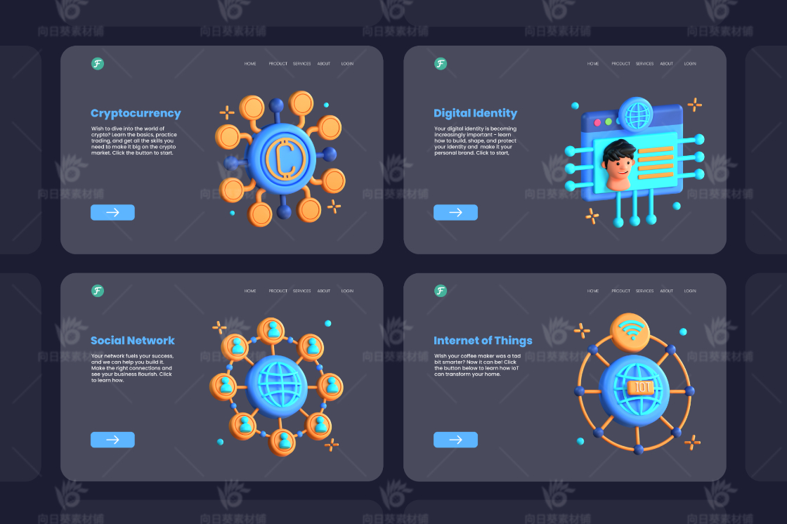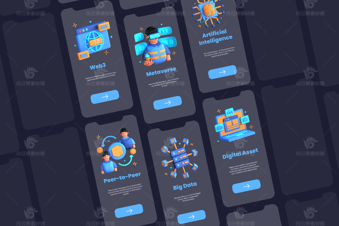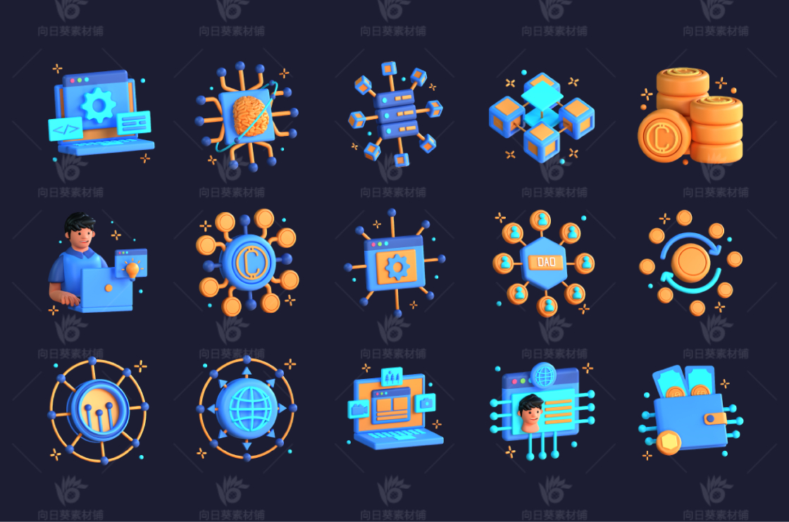除了具有所有现代Web3概念外,这些3D立体图标包括:应用程序编程接口(API)、人工智能(AI)、大数据、区块链、硬币、创造者、加密货币、去中心化应用程序(dApp)、去中心化自治组织(DAO)、去中心化交易所(DEX)、去中心化金融(DeFi)、去中心化Web、数字资产、数字身份、数字钱包、未来、物联网、元宇宙、网络基础设施、不可替代令牌(NFT)、开源、点对点(P2P)、智能合约、社交网络、交易、用户,虚拟现实,网络演进,Web3 (web3.0),无线网络