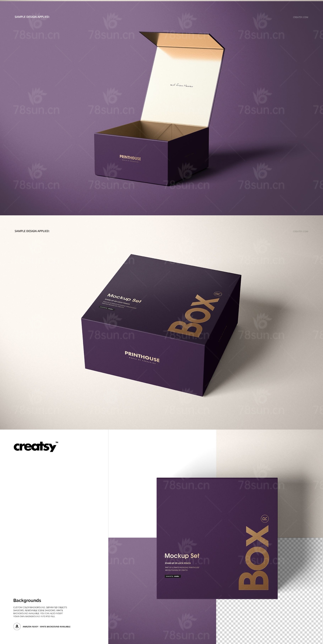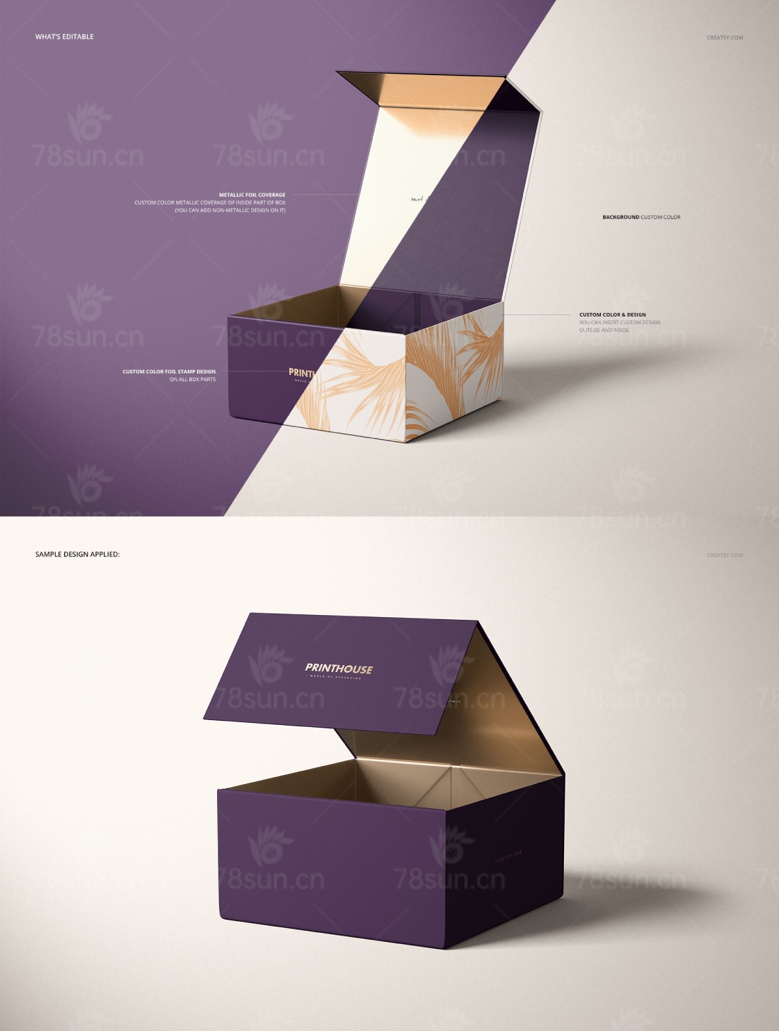 多个角度礼品礼盒包装盒智能贴图样机,可以为背景设置自定义颜色和纹理,改变盒子的设计也很容易。你可以移除盒子模型层中的物体和阴影。这个模型保证使你的设计从人群中脱颖而出。配有PDF用户手册,以帮助您快速模拟您的设计。