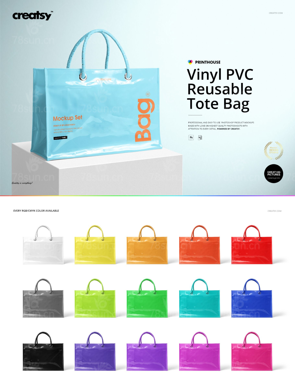 乙烯基PVC可重复使用的手提袋是一组分层的,可编辑的文件。在Adobe Photoshop中编辑智能对象和颜色层允许您自定义设计。