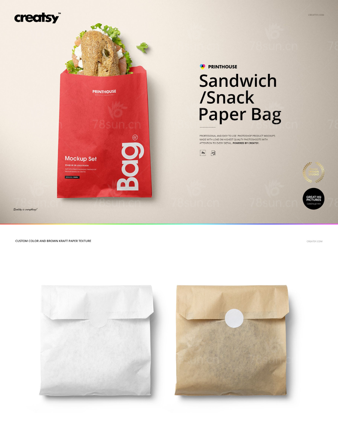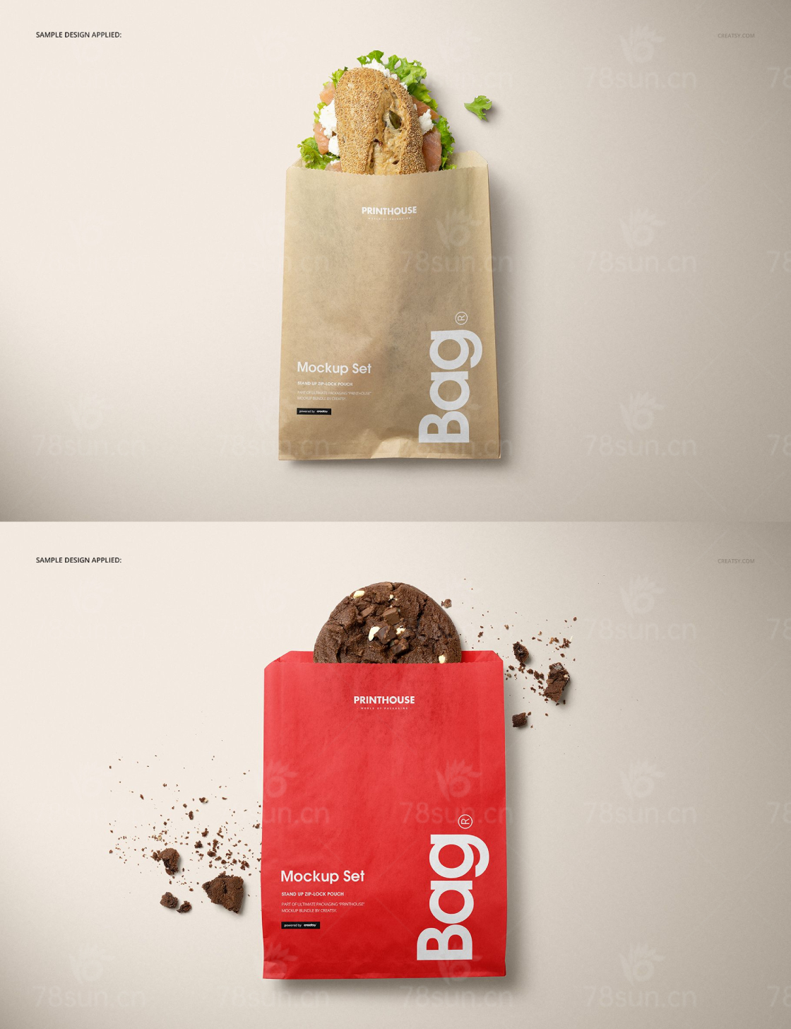 三明治/零食纸袋模型集是一个具有可编辑Adobe Photoshop图层的模型文件,它使用智能对象,颜色图层和阴影来描绘您在实际产品上的设计。