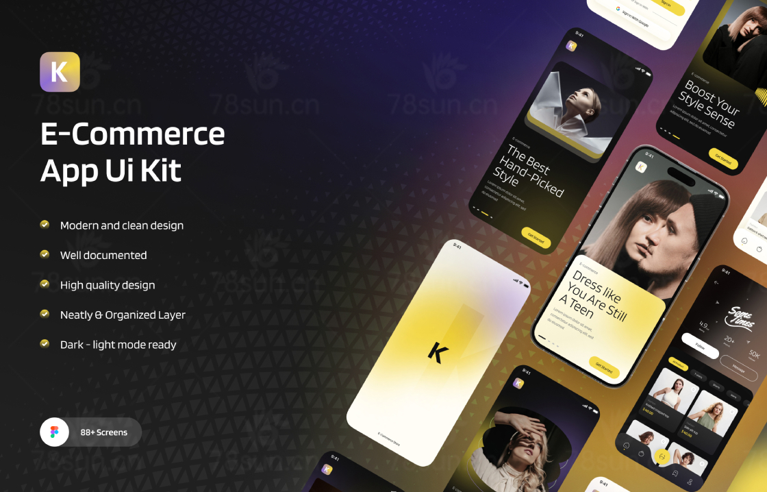 时尚服装电子商务应用程序,拥有超过88个高级屏幕。UI Kit的特点是帮助用户找到所需的产品,进行购买,并管理他们的订单。它的设计以用户为中心,专注于创造一个无缝和愉快的购物体验,既有功能又有视觉吸引力。