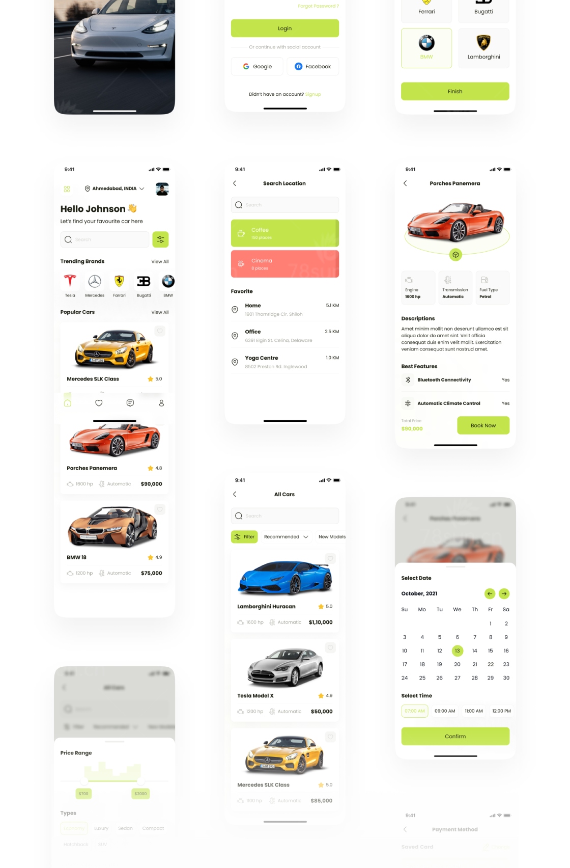 汽车租赁是一个完全定制的各种场景,包括上车,登录/注册,身份验证,主页,类别,个人资料,以及更多。租车app ui包括全局风格指南、动态组件、自动布局和变体。