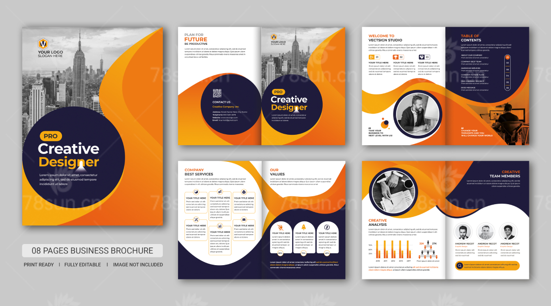 橙色企业公司简介版面设计商务宣传画册,psd矢量图形,完全可编辑,共8页 声明:本站所有资源版权均属于原作者所有,这里所提供资源均只能用于参考学习用,请勿直接商用。若由于商用引起版权纠纷,一切责任均由使用者承担。更多说明请参考 VIP介绍。