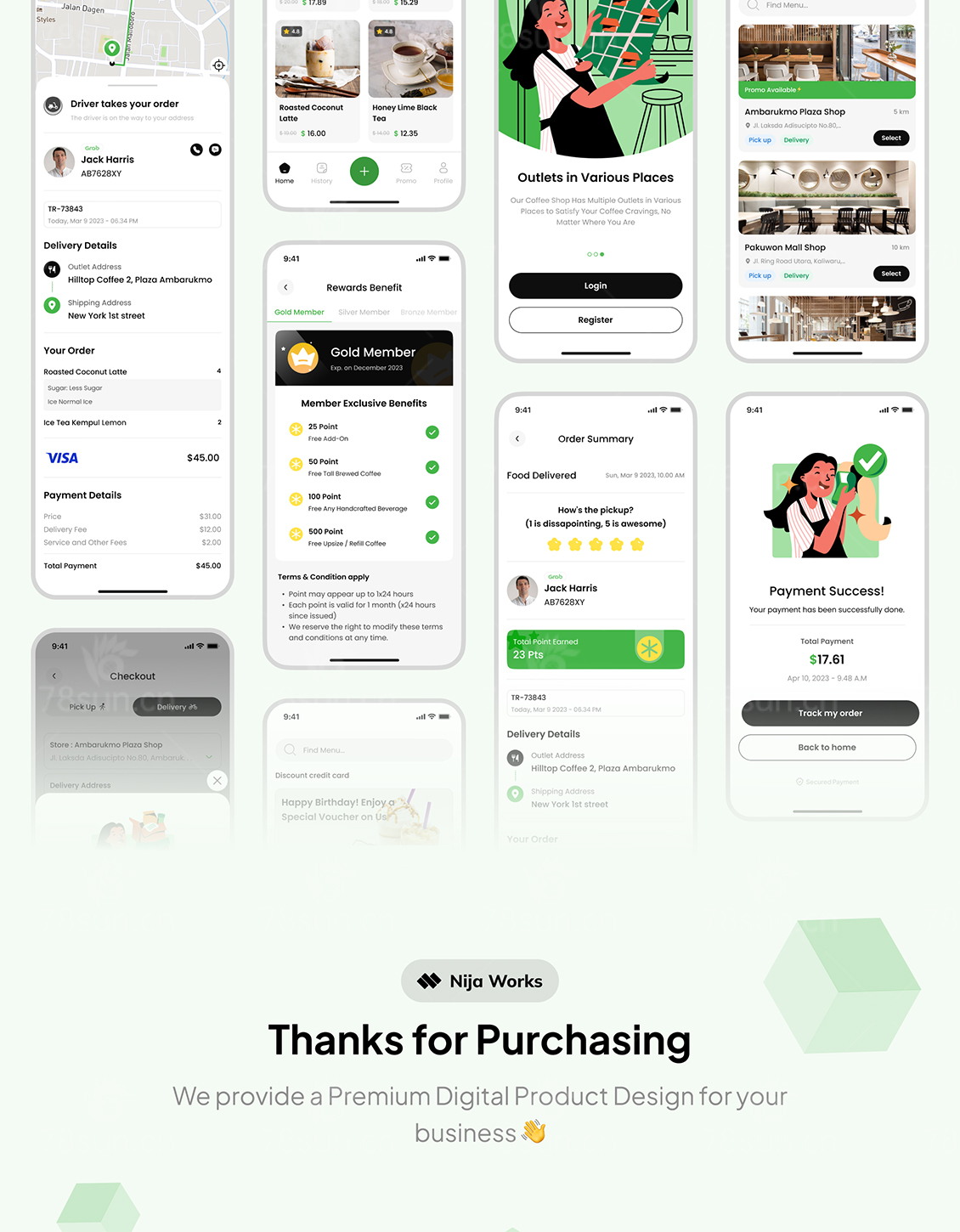 移动应用咖啡店UI工具包,具有简单和极简的设计。由100多个高级移动屏幕组成,将支持您创建自己的咖啡店业务。