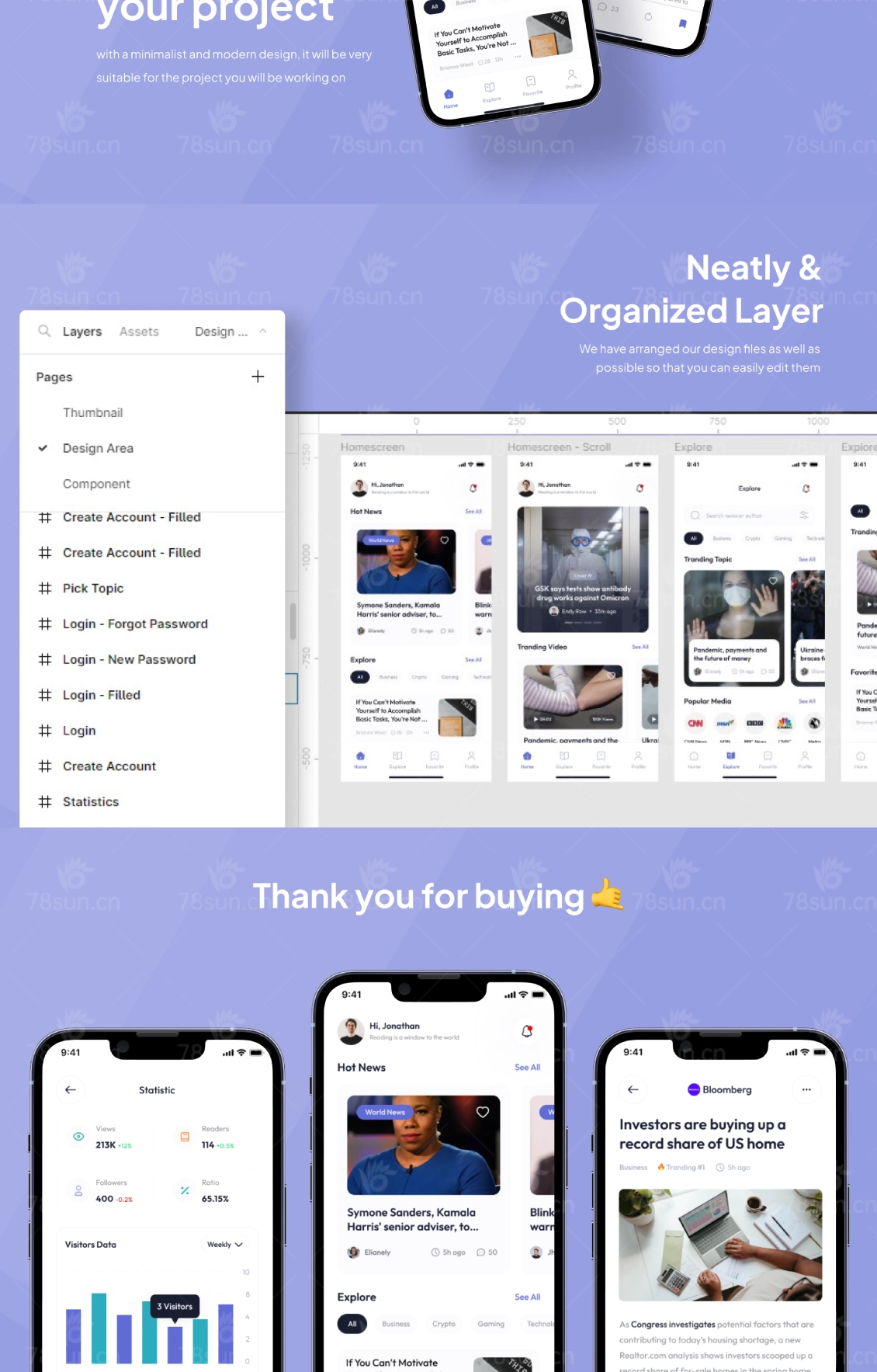 40+屏幕的新闻门户应用程序设计UI工具包。