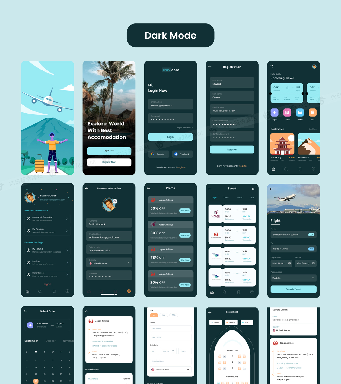 预订票务应用程序是一个高级和高质量的所有机票和酒店预订,如航班,酒店,火车和公共汽车。82个高质量的屏幕,易于在Figma和Sketchapp中使用。也可在光明和黑暗的主题。