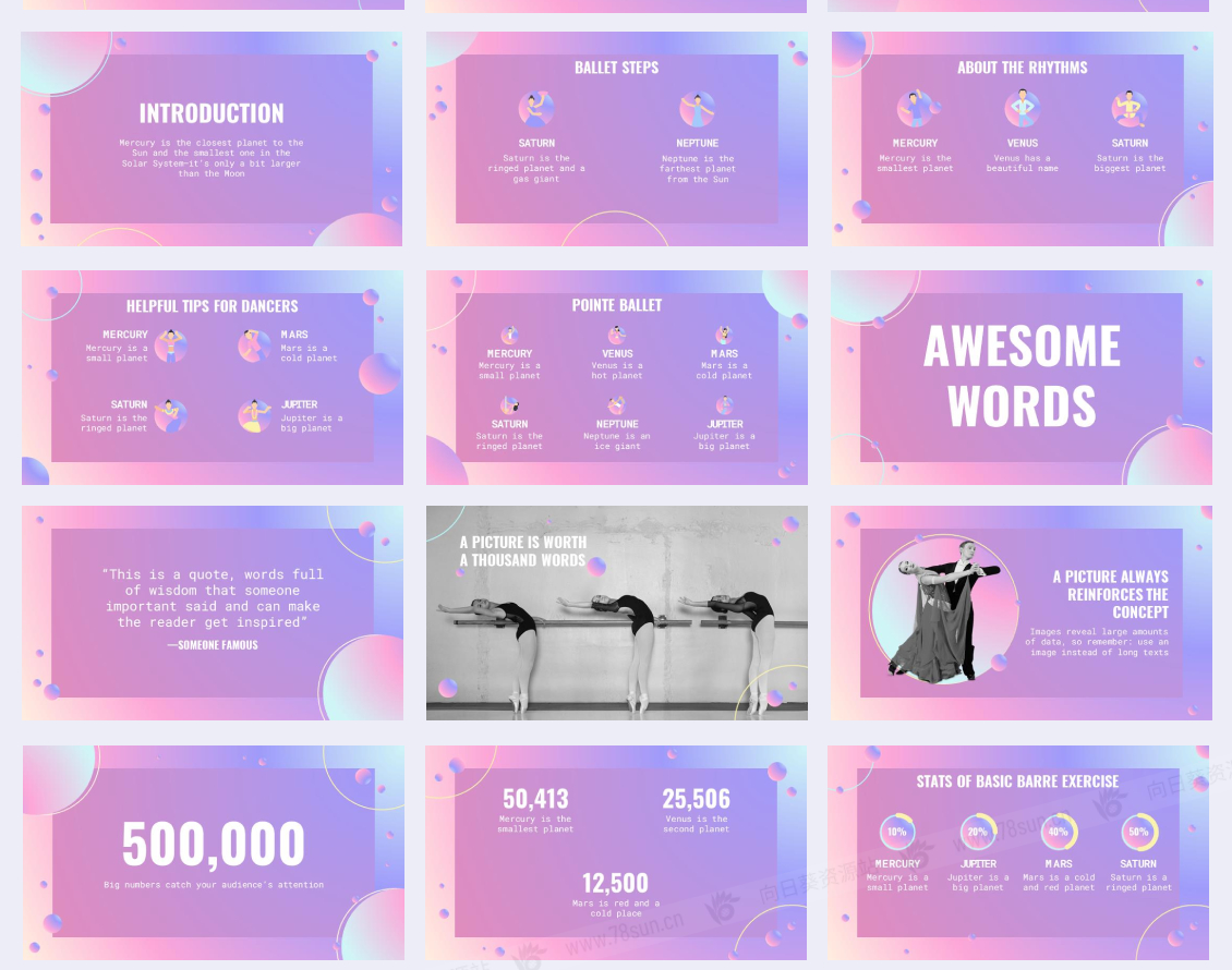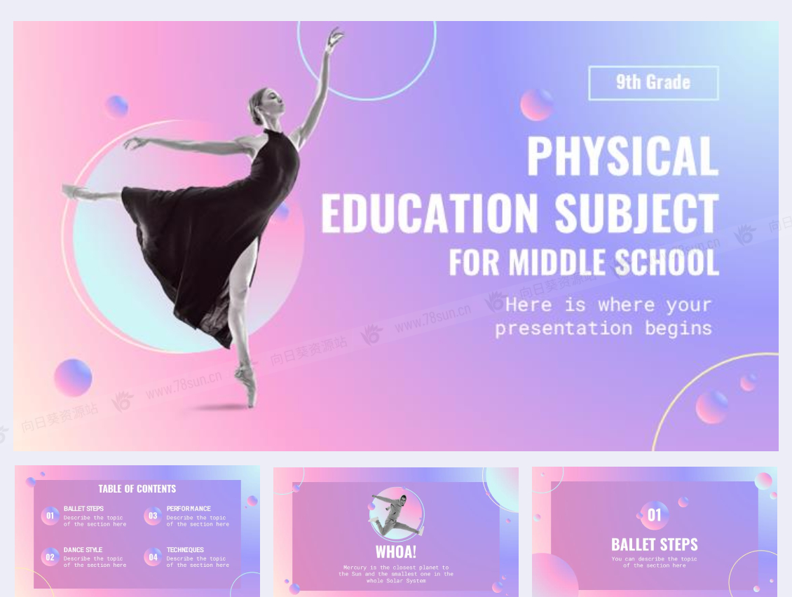 渐变柔美舞蹈教学女性产品幻灯片PPT模板,共35个页面 声明:本站所有资源版权均属于原作者所有,这里所提供资源均只能用于参考学习用,请勿直接商用。若由于商用引起版权纠纷,一切责任均由使用者承担。更多说明请参考 VIP介绍。
