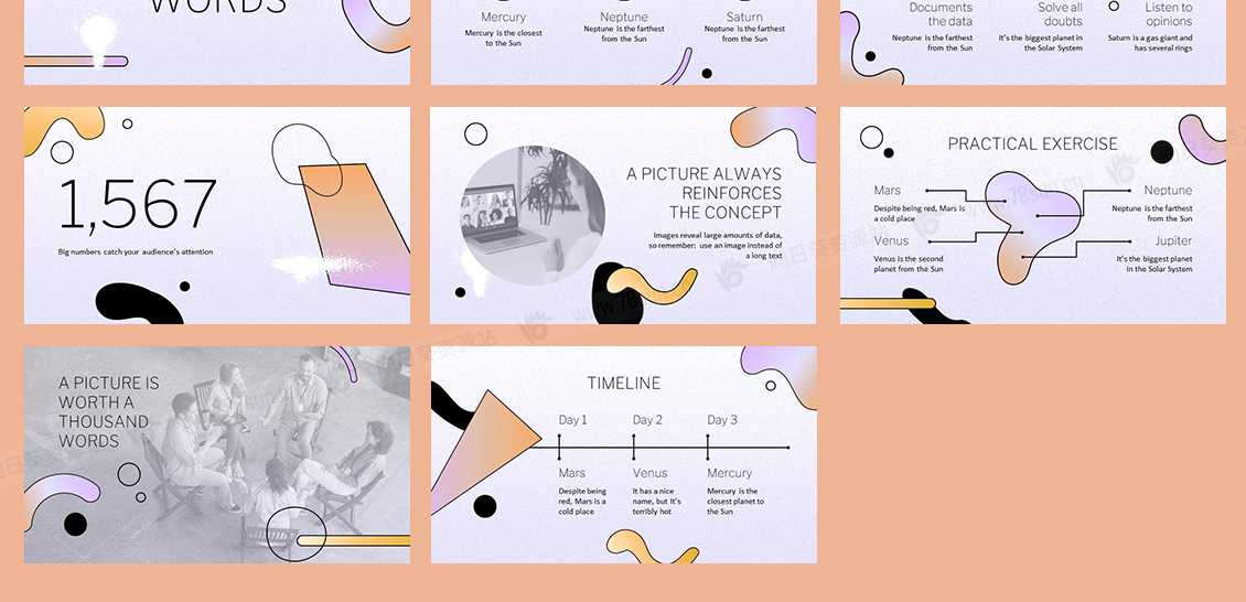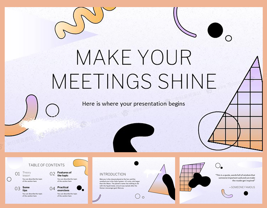 潮流孟菲斯风格毕业答辩工作总结汇报幻灯片PPT模板,共24个页面 声明:本站所有资源版权均属于原作者所有,这里所提供资源均只能用于参考学习用,请勿直接商用。若由于商用引起版权纠纷,一切责任均由使用者承担。更多说明请参考 VIP介绍。