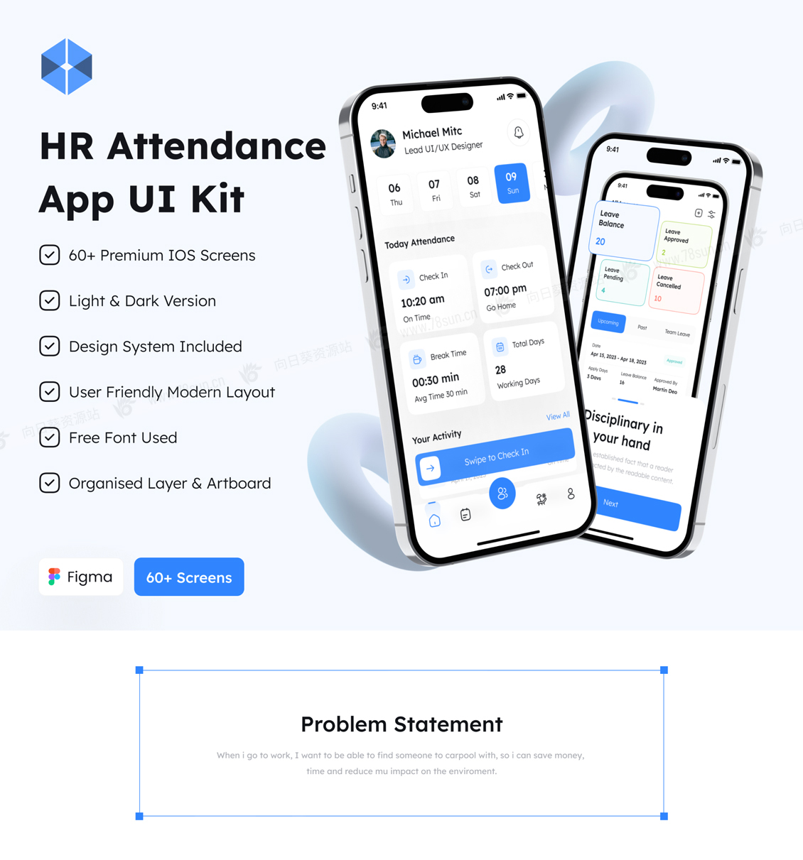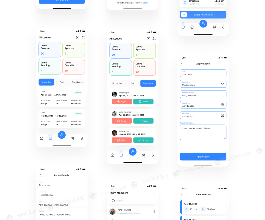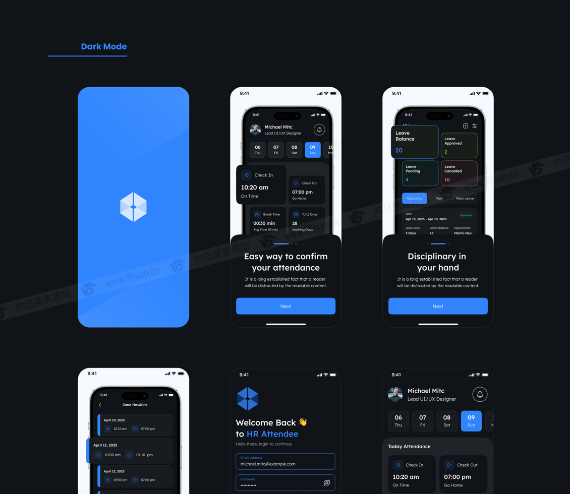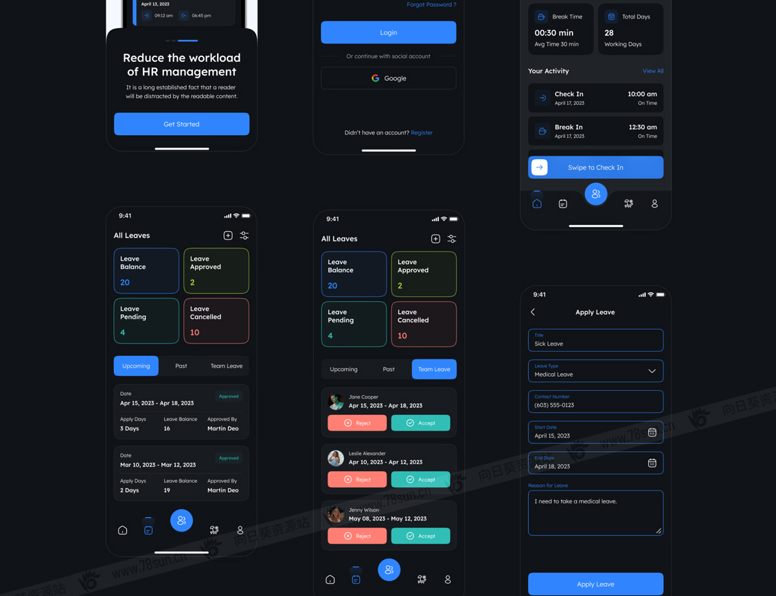 Hr人力资源人事考勤应用UI工具包,这是一套全面的超过60个像素完美的屏幕,专为在Figma中轻松使用而设计。有了这个工具包,你可以很容易地自定义你喜欢的设计,充分利用Figma的所有功能,如全局颜色,字体样式,动态组件和变体。此外,UI套件可在光明和黑暗的主题,提供灵活性,以满足您的特定需求。