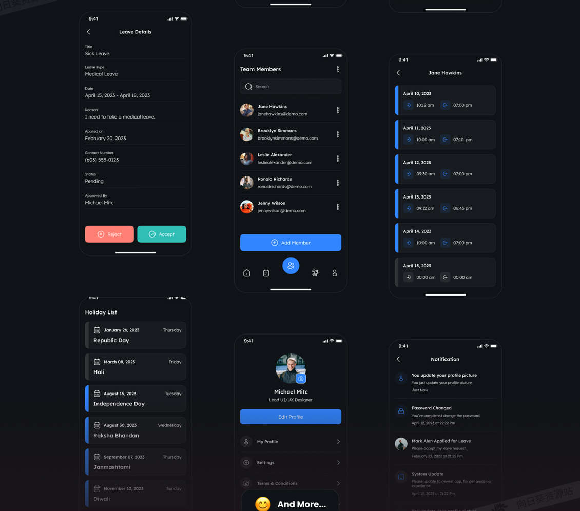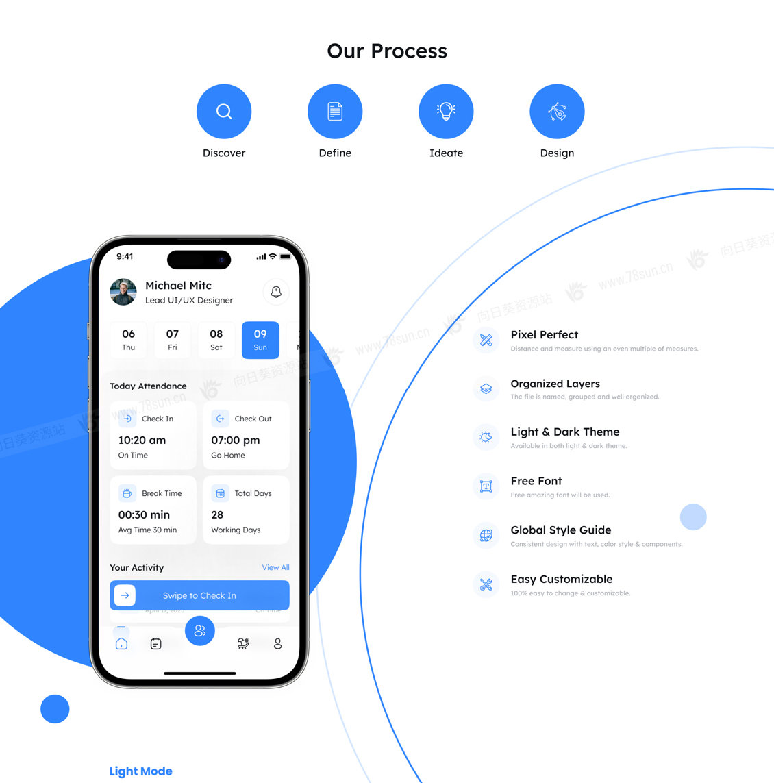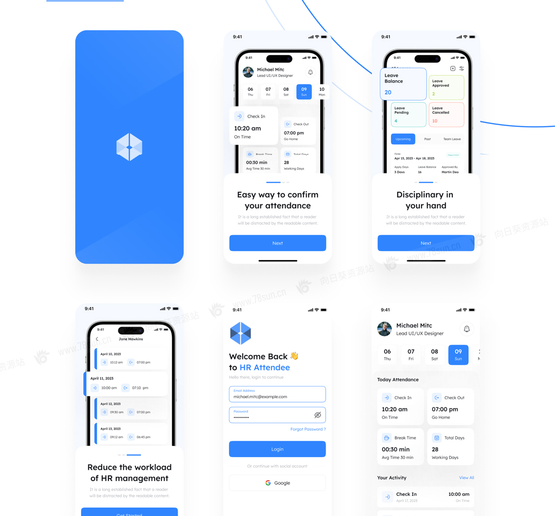 Hr人力资源人事考勤应用UI工具包,这是一套全面的超过60个像素完美的屏幕,专为在Figma中轻松使用而设计。有了这个工具包,你可以很容易地自定义你喜欢的设计,充分利用Figma的所有功能,如全局颜色,字体样式,动态组件和变体。此外,UI套件可在光明和黑暗的主题,提供灵活性,以满足您的特定需求。
