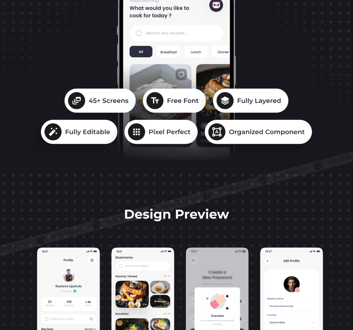 专为食品配方应用量身定制的超过45个设计精美的移动屏幕。从推荐食谱到一步一步的烹饪说明,发现一个愉快的烹饪体验,你需要一个无缝的烹饪之旅。为美食食谱项目提供了一个引人入胜且用户友好的烹饪体验平台。UI Kit提供了完全响应的组件和屏幕,确保在各种设备尺寸上的无缝体验。此外,它还提供了全面的文档,提供了可重用的UI元素,便于定制和方便。