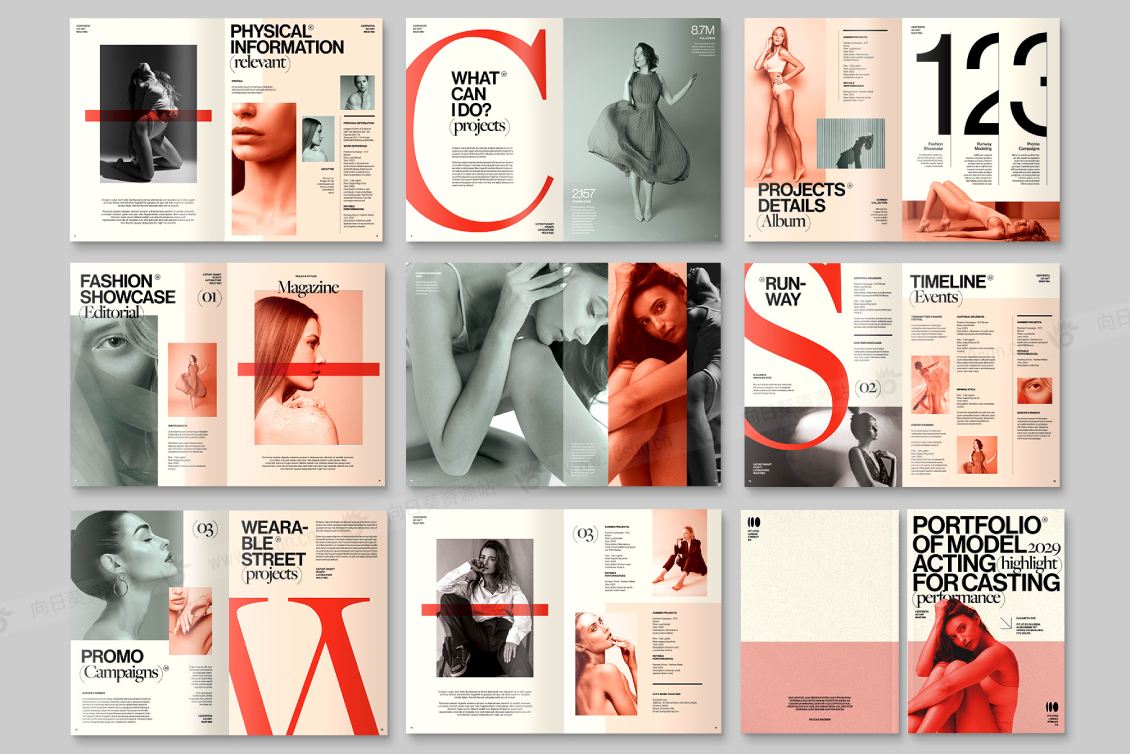 一个多功能、专业设计的 InDesign INDD 格式模板。非常适合希望以双折小册子或双折目录格式展示其作品或产品的摄影师、设计师和企业。非常适合创建时尚的客户演示文稿、产品目录或商业杂志。其创新和时尚的设计一定会在任何环境中给人留下深刻印象,无论是公司活动还是摄影展览。对于那些旨在在他们的投资组合中留下持久印象的人来说,这种布局是一个必备工具。