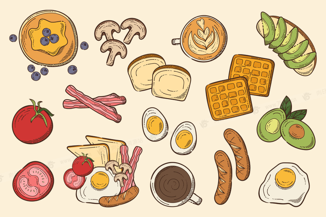 Illustrator Ai、EPS 和 PNG 剪贴画格式的早餐矢量插图集,用这组早餐食物和配料插图以数字格式烹制早餐。这些早餐元素将派上用场,用于大量与食品和早午餐相关的项目,例如菜单和海报或早餐食品的包装和品牌。