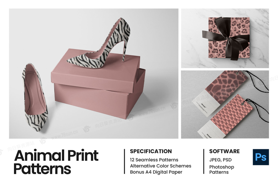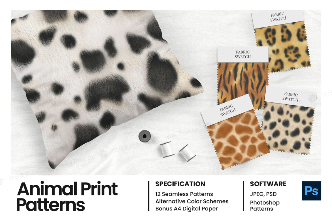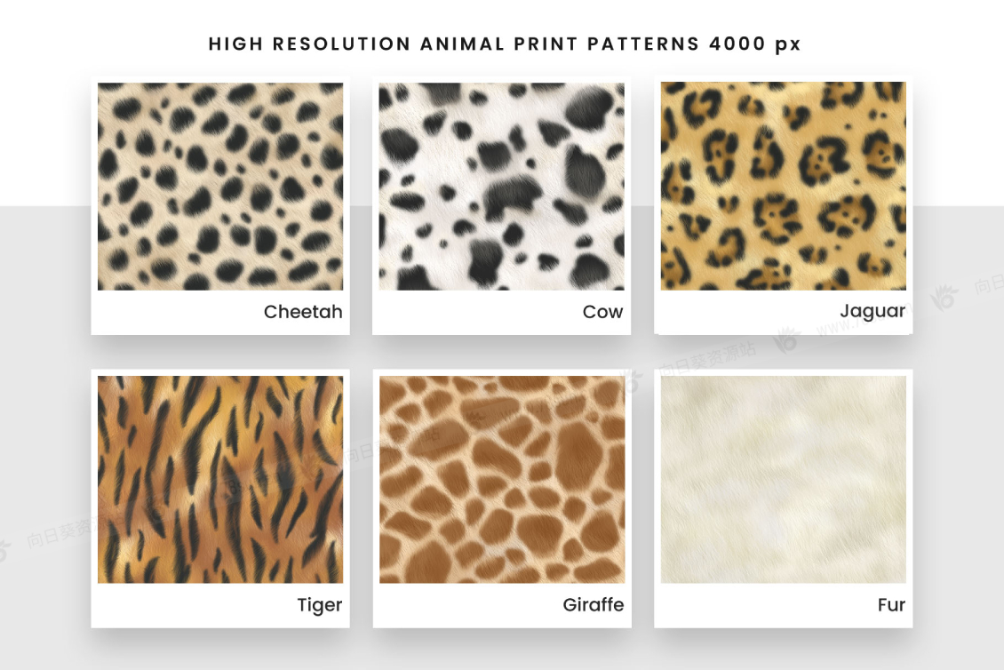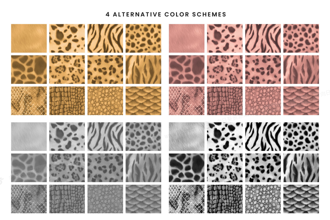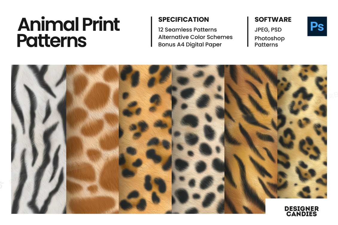 12种动物图案的集合包括老虎,豹子,美洲虎,斑马,长颈鹿,牛,蜥蜴,鱼,蛇,猎豹,鳄鱼和毛皮动物的皮肤纹理和图案。每种动物印花图案还有 4 种可供选择的单调配色方案,包括银色、白色、粉红色和金色。每个图案都是使用数字绘画技术手绘的,给人一种独特的细节和插图的感觉。每个动物印刷图案都带有 Photoshop PAT 图案和 JPEG 格式。还有精选的 A4 数字纸。