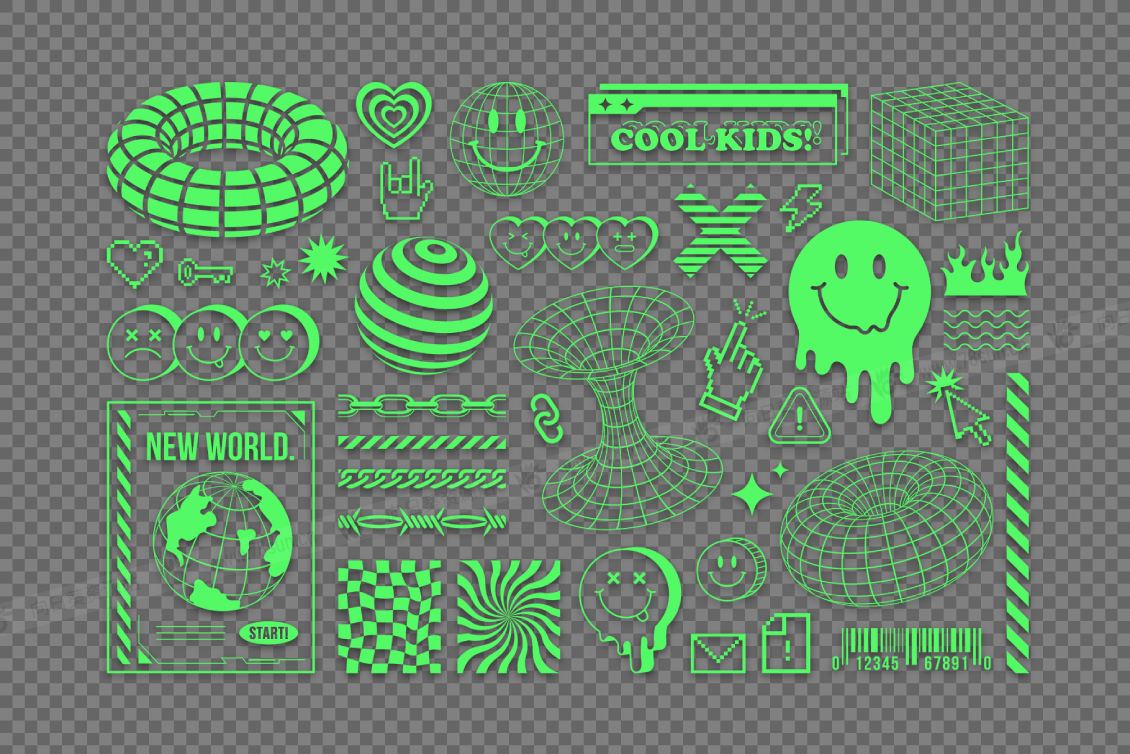 Illustrator Ai 和 Vector EPS 格式的复古 Y2k 风格矢量插图和线框元素这些Y2K矢量插图非常适合为任何项目或活动带来复古风格。从线框到笑脸,这些 90 年代至 2000 年代的图形非常适合怀旧爱好者,也是为任何项目添加复古风格的好方法。
