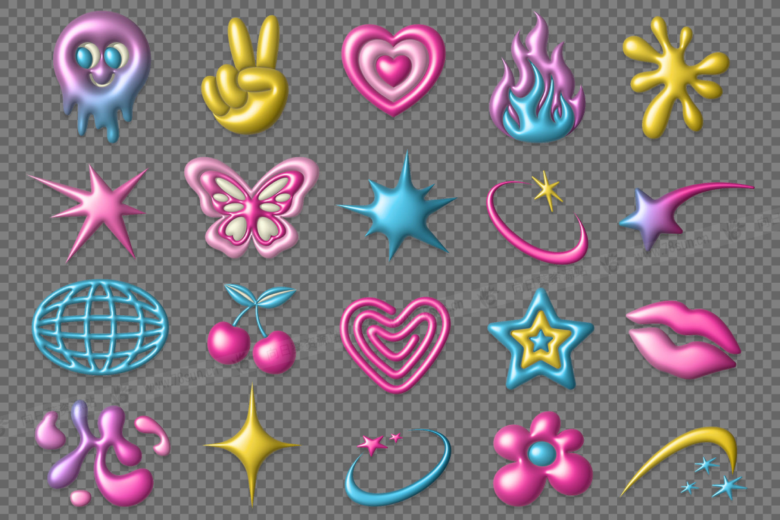 Y2K矢量插图和PNG剪贴画为您的作品增添90年代和2000年代的怀旧情怀!Y2K Elements Set 是 90 年代和 2000 年代的复古 3D 图形、插图和剪贴画的集合。非常适合为您的项目添加独特的 Y2k 怀旧情怀。该套装包括各种具有 3D 浮雕效果的 Y2k 元素和符号。非常适合平面设计师、活动策划者或任何希望为他们的作品添加怀旧复古风格的人。