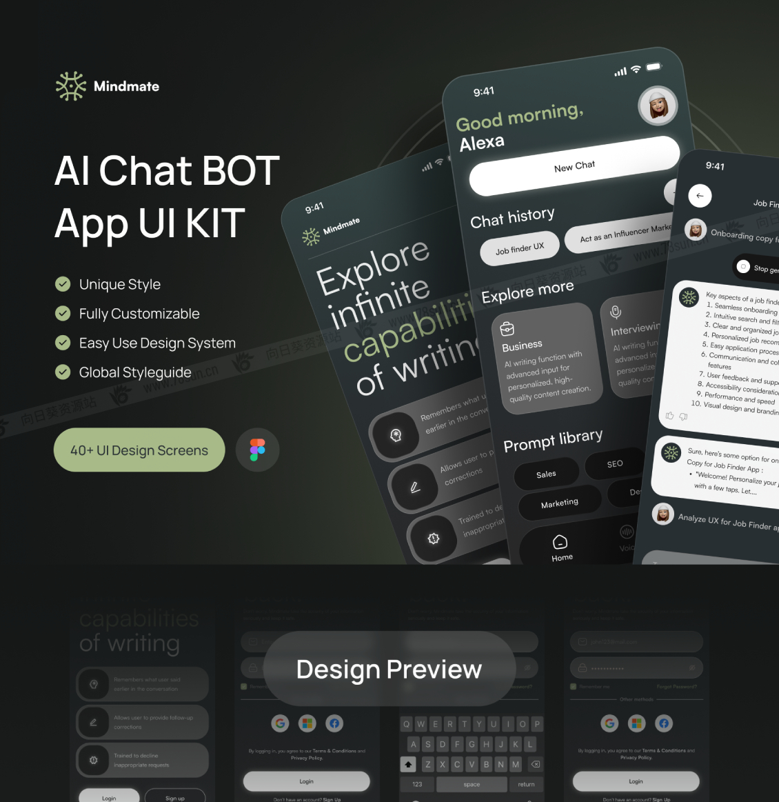 Mindmate是一款创新的人工智能聊天助手,旨在激发创造力并提供富有洞察力的基于文本的想法。Mindmate利用先进的自然语言处理能力和丰富的知识,为用户提供无缝和直观的体验,产生发人深省的概念,集思广益的想法,探索新的视角。Mindmate的核心是一个即时驱动的系统,用户输入一个问题或主题,就可以启动创意生成过程。无论你是一个寻找灵感的作家,一个为文章寻找新视角的学生,还是一个需要创造性解决方案的专业人士,Mindmate都可以帮助你。我们准备了一个UI KIT,你将获得一个高质量的产品,通过获得40多个优质屏幕,这些屏幕是通过关注图层,布局的细节而制作的,并且非常容易编辑。