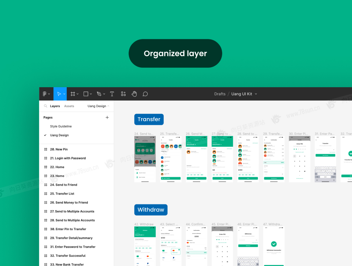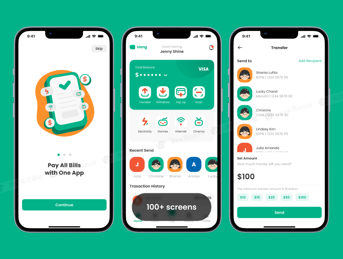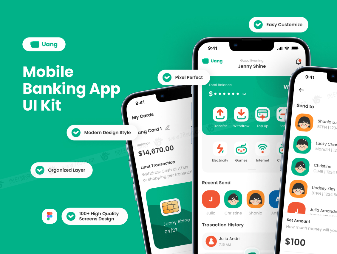 Uang是一款简洁现代的手机银行应用,100+高品质屏幕设计,易于Figma使用,Uang工具包经过精心设计并按功能分组,使您可以轻松地自定义它们以满足您的需求