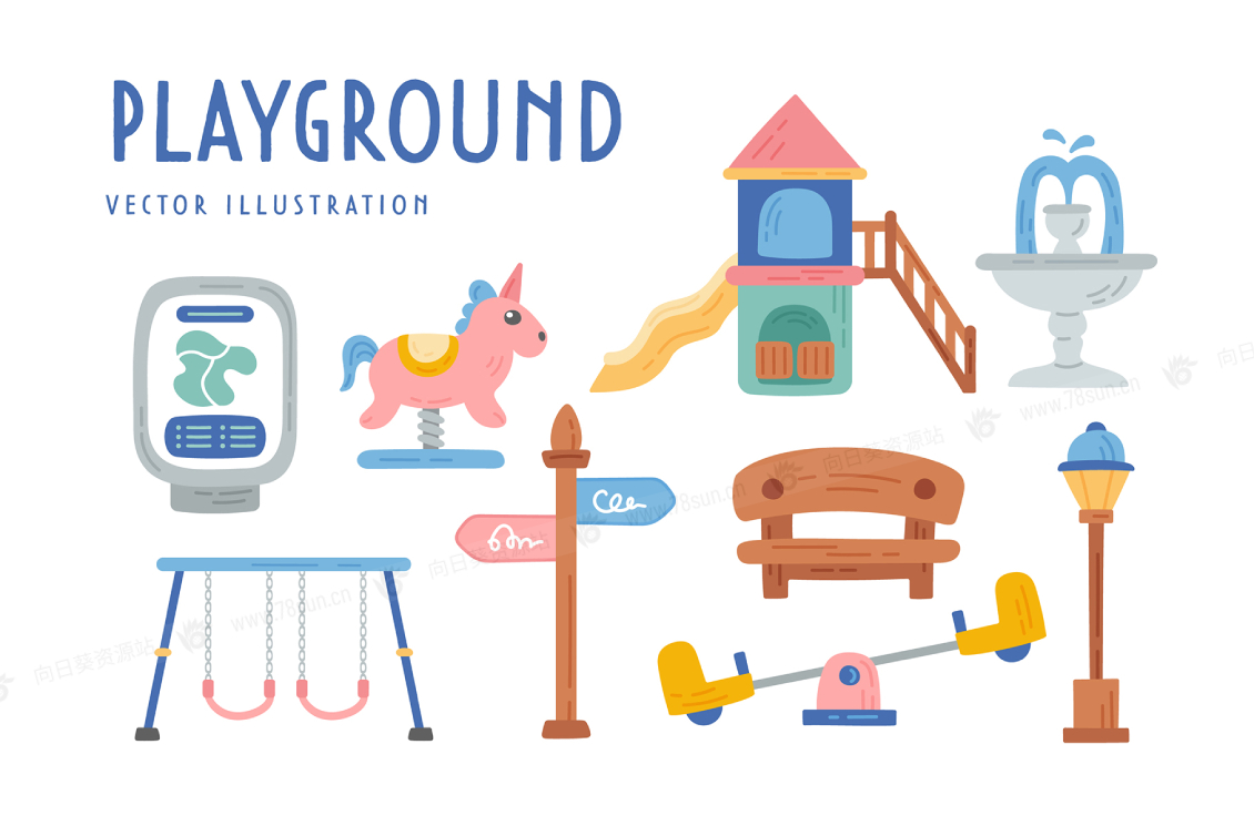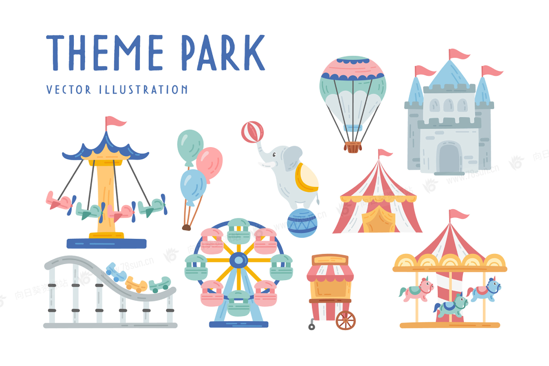 - 10 个游乐场和 10 个主题公园插图,营造出熙熙攘攘的兴奋场景