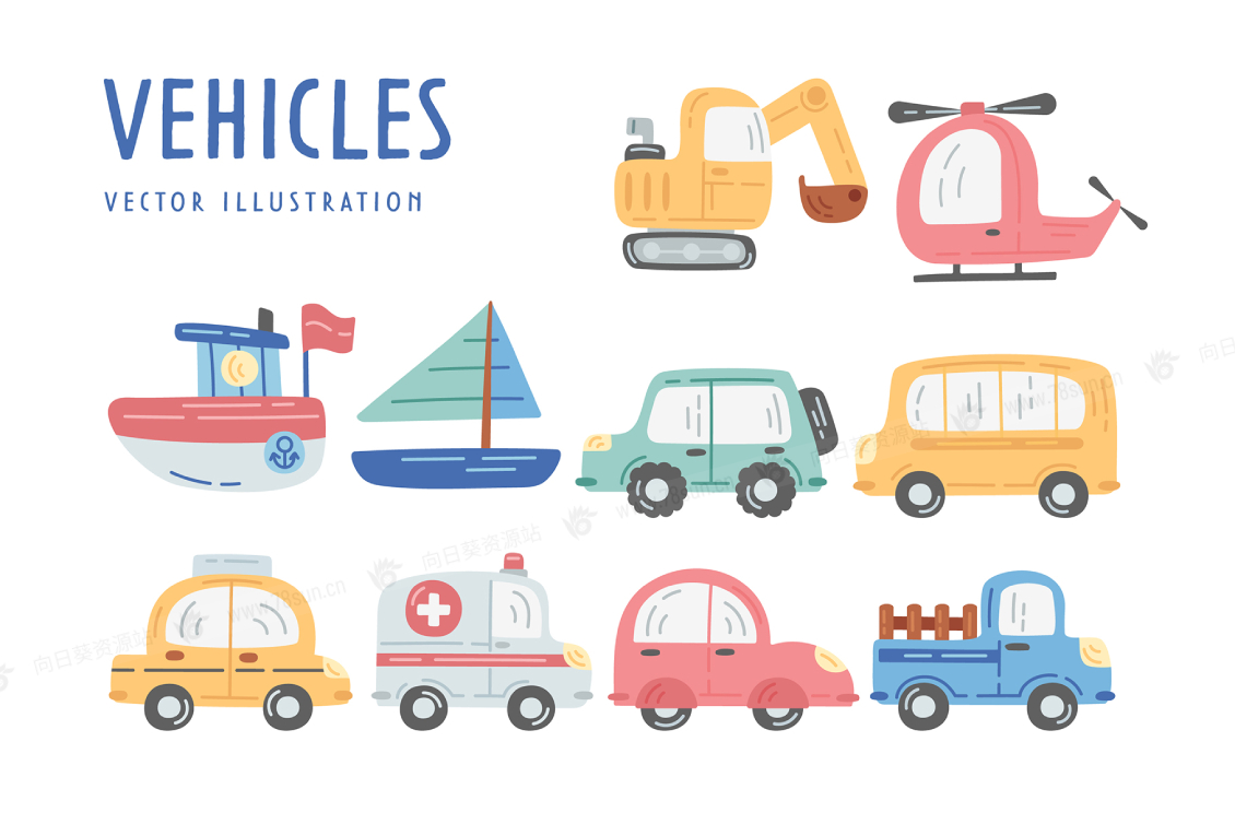 - 10 车辆插图:从挖掘机和直升机到船只、汽车,甚至校车和救护车