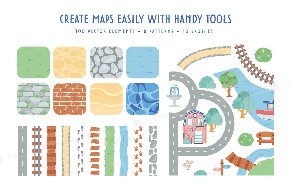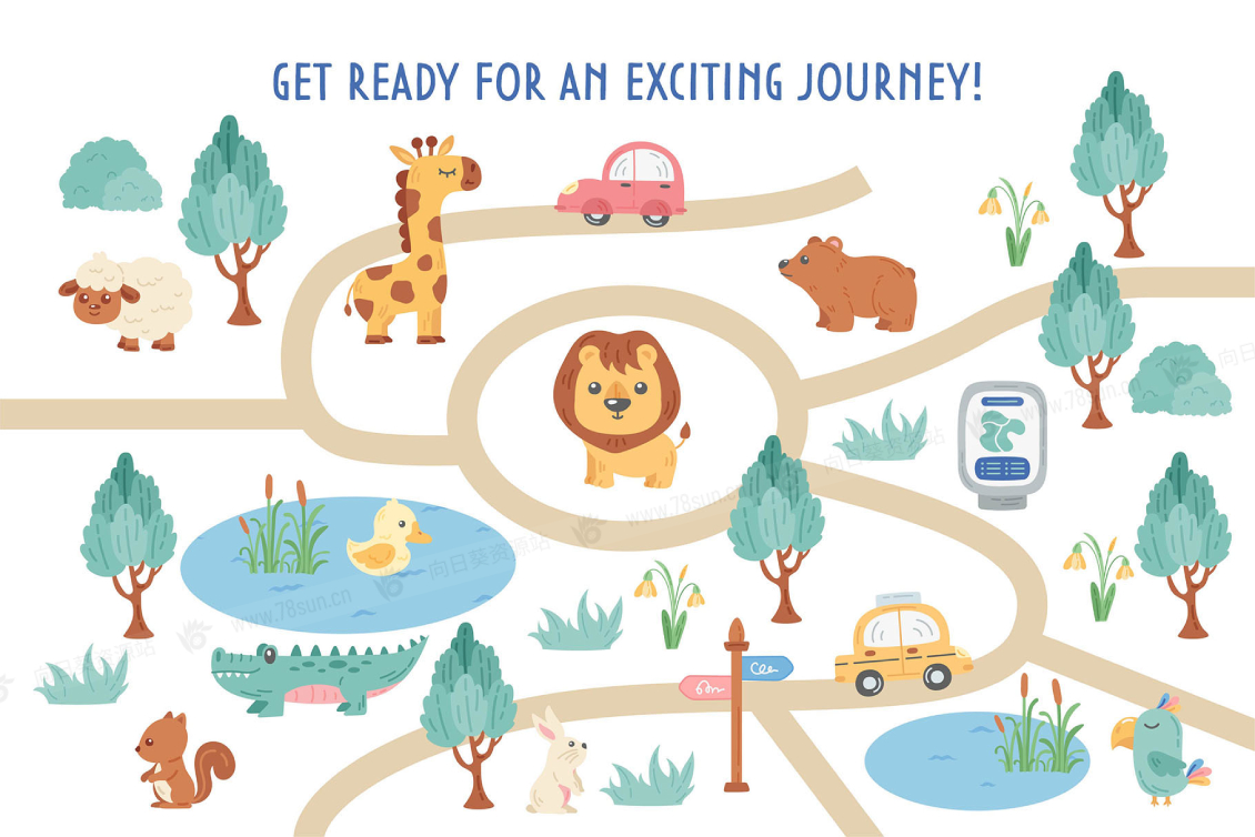 儿童地图创建工具包是各种项目的理想选择,包括儿童读物、教育材料、游戏设计等。它非常适合任何需要奇思妙想、幻想和乐趣的项目,当然还有可爱的儿童插图元素。因此,无论您是为海盗主题冒险设计藏宝图,为超级英雄故事设计城市地图,还是为动物指南设计动物园布局,这款套件都能满足您的一切需求,此项目采用 Illustrator Ai、矢量EPS 和 PNG 格式。