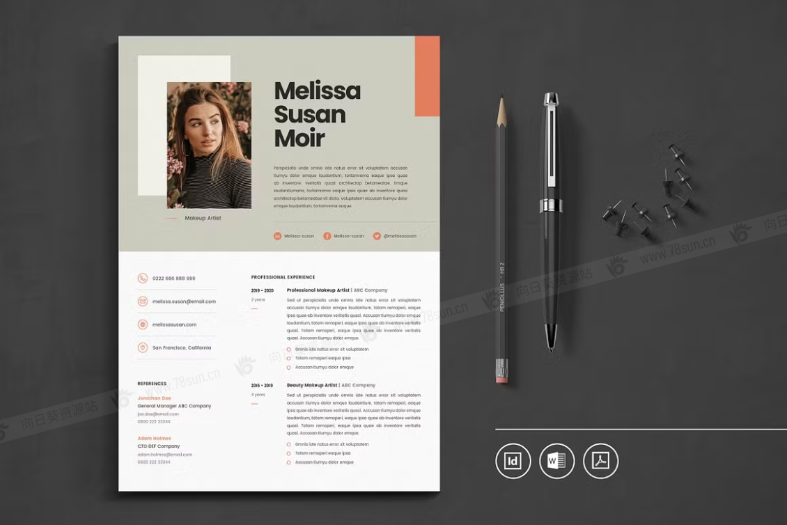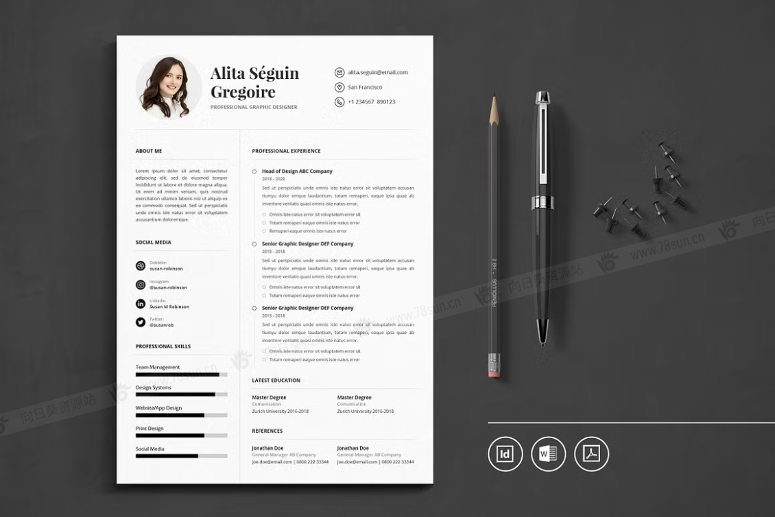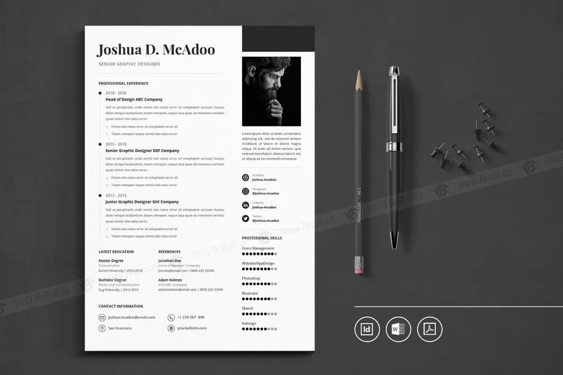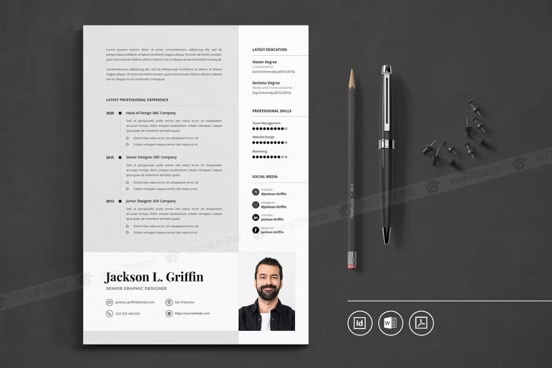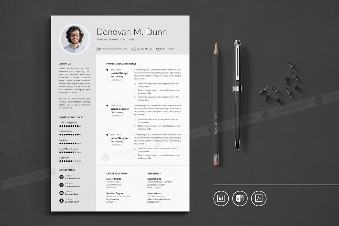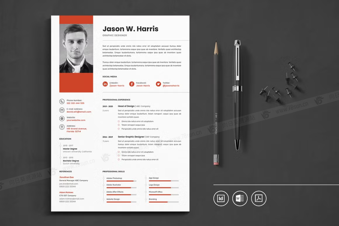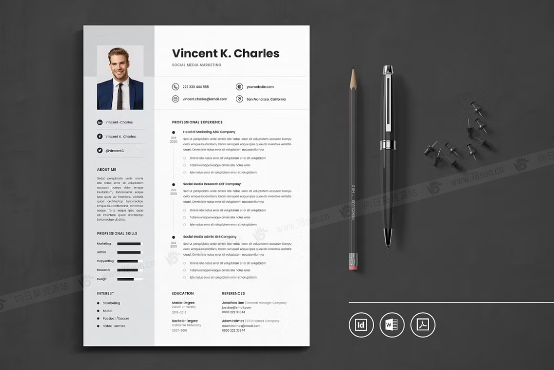 这个模板是为你制作的,让你的简历看起来专业和现代。它适合求职者、员工、商人、平面设计师、专业艺术家、商业教练、设计师、开发人员、社交媒体经理、程序员等等。此模板支持Adobe Indesign,Microsoft Word