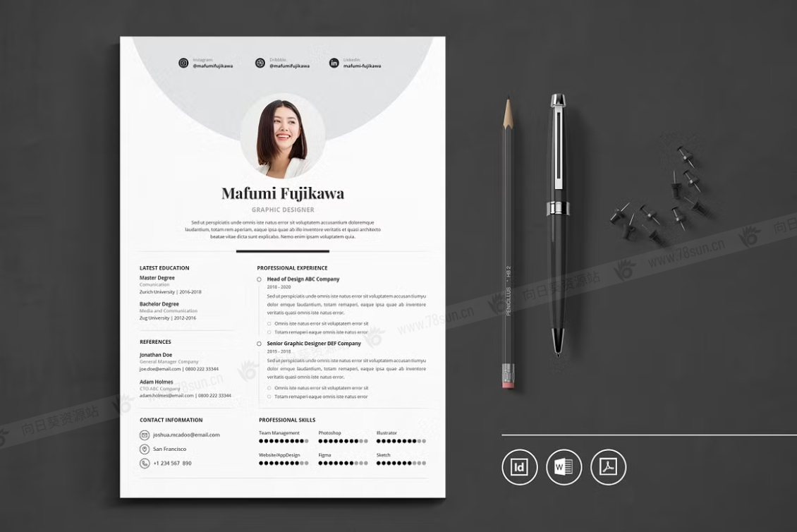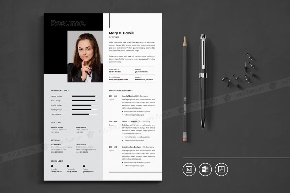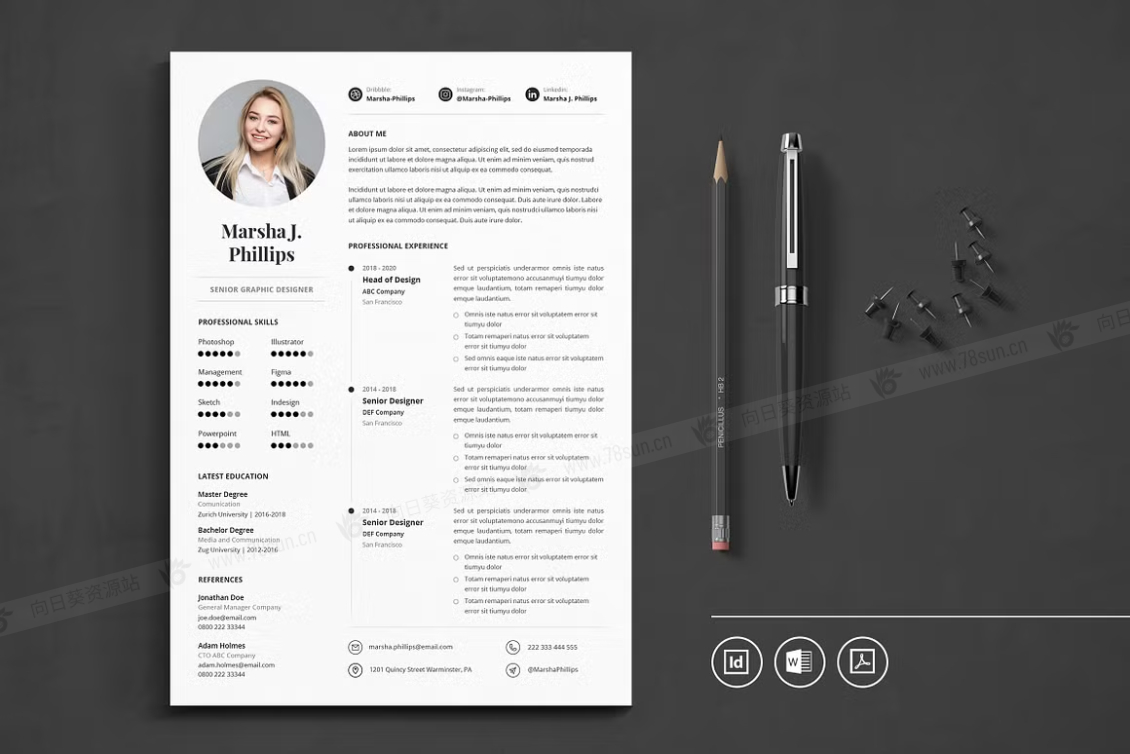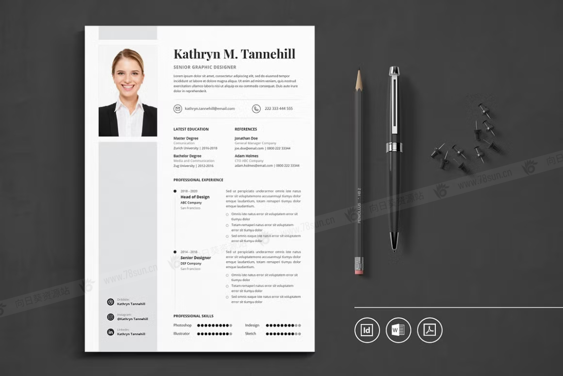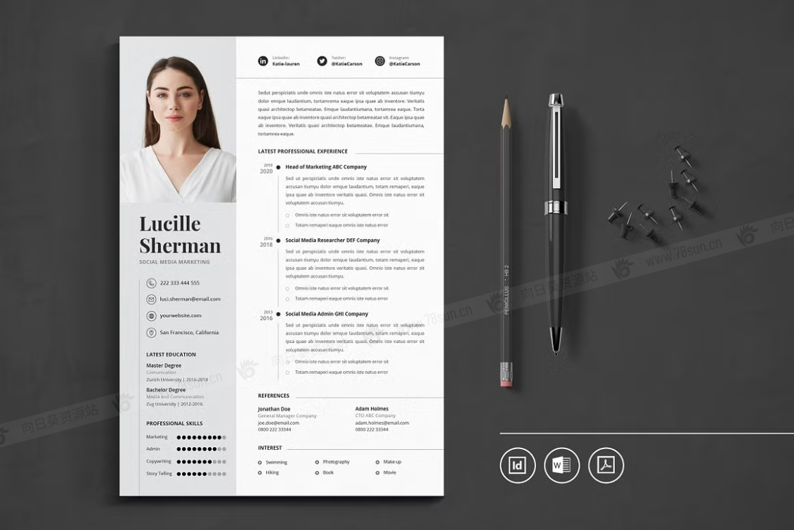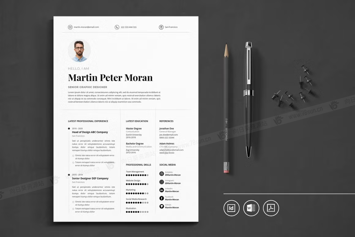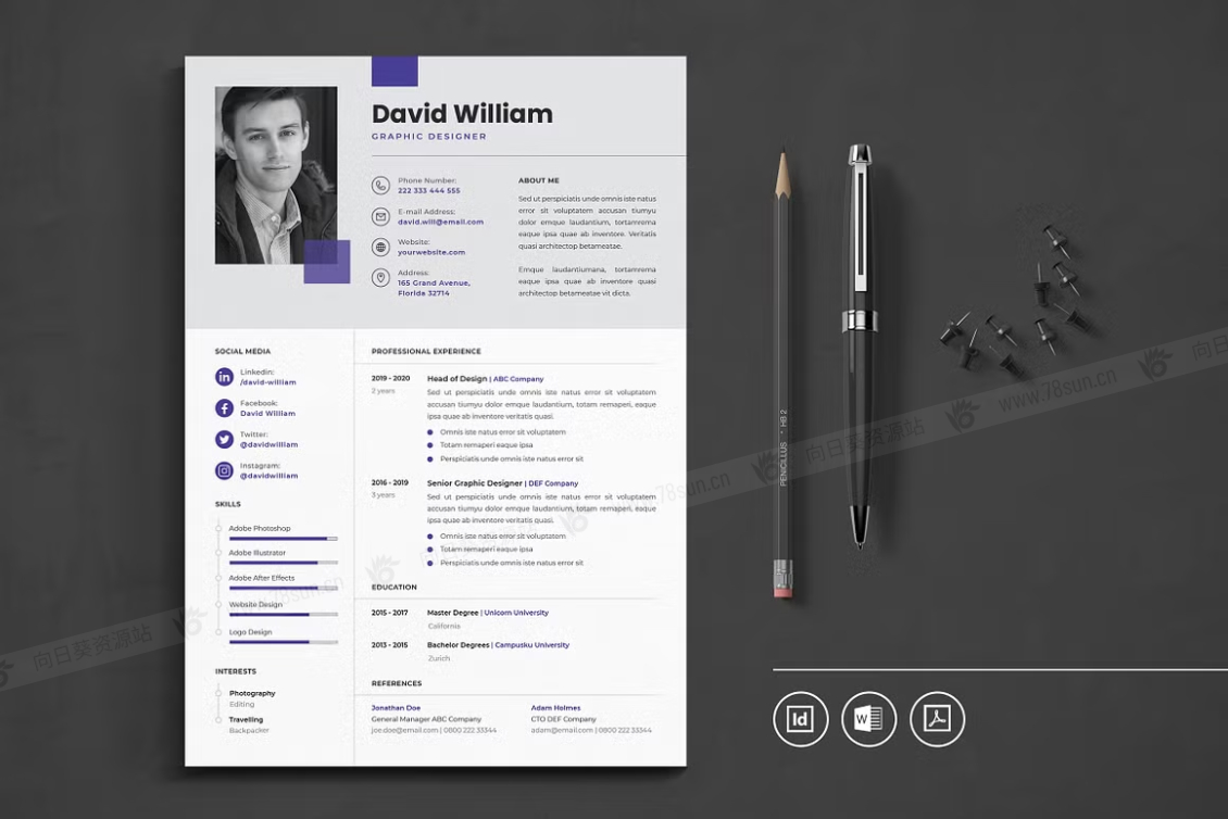 这个模板是为你制作的,让你的简历看起来专业和现代。它适合求职者、员工、商人、平面设计师、专业艺术家、商业教练、设计师、开发人员、社交媒体经理、程序员等等。此模板支持Adobe Indesign,Microsoft Word