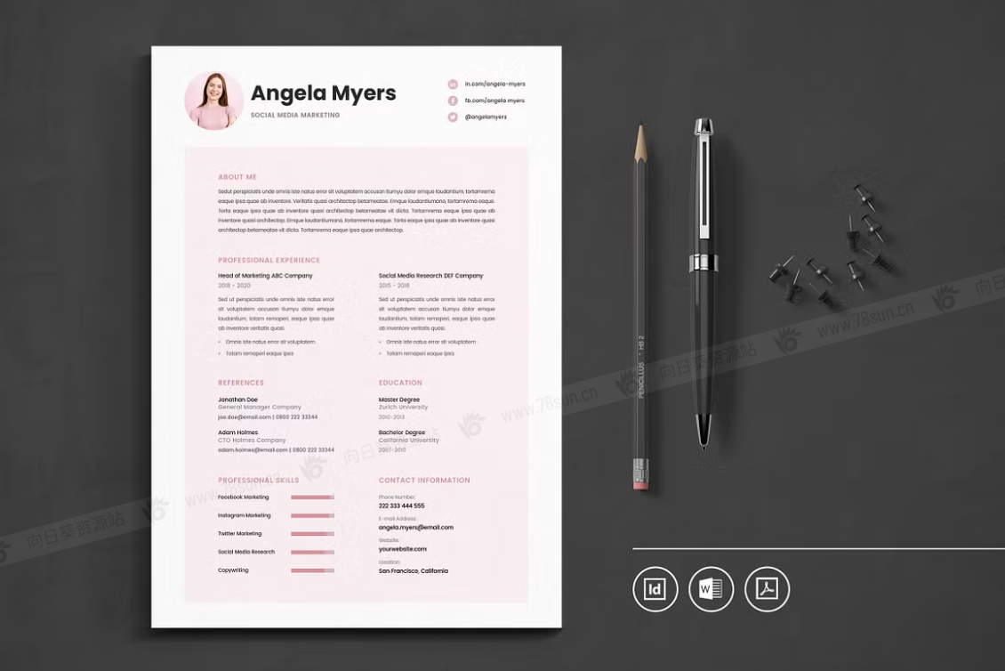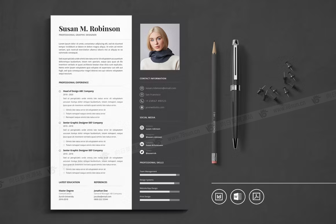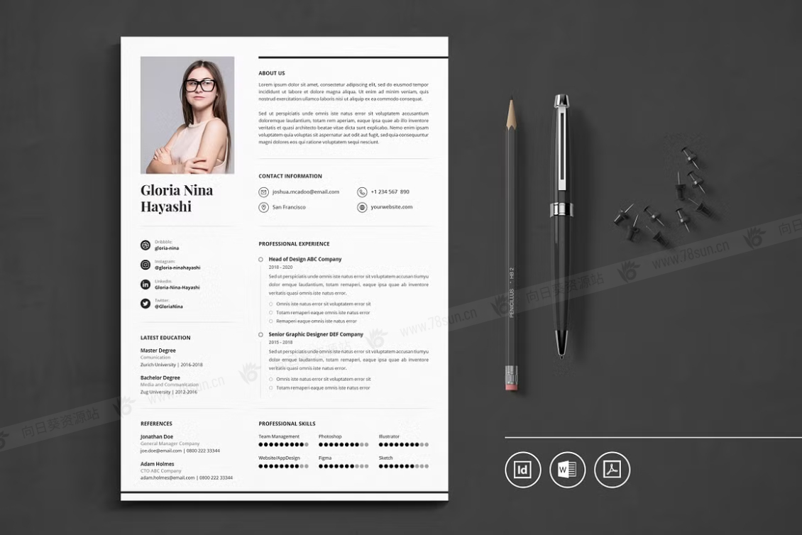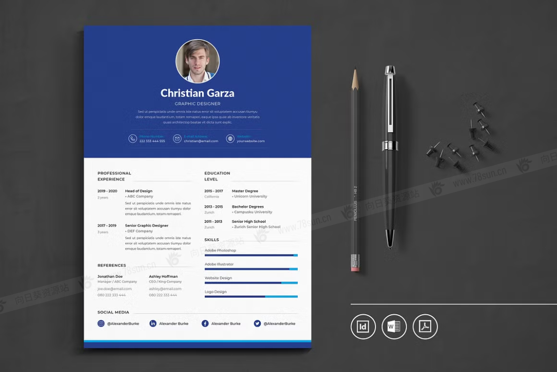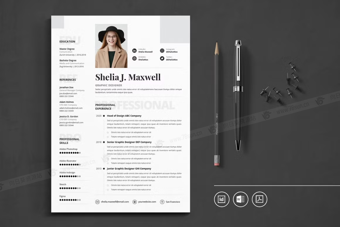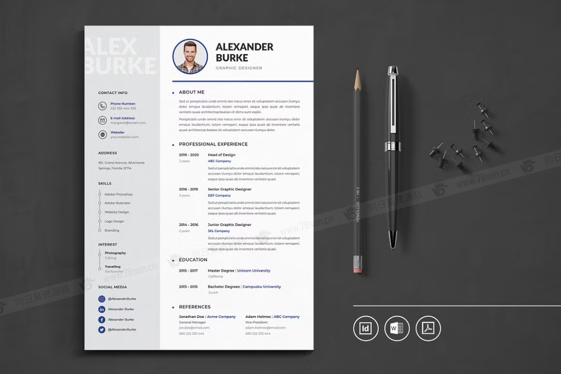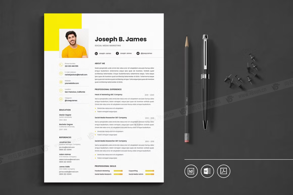 这个模板是为你制作的,让你的简历看起来专业和现代。它适合求职者、员工、商人、平面设计师、专业艺术家、商业教练、设计师、开发人员、社交媒体经理、程序员等等。此模板支持Adobe Indesign,Microsoft Word