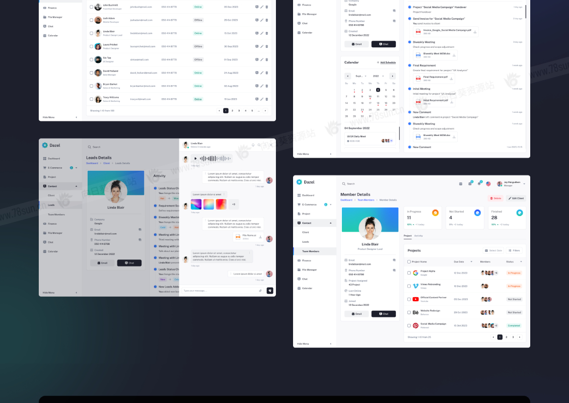 7 种不同的仪表板、电子商务管理面板、项目管理、联系人管理、财务、文件管理、聊天、日历、分析等