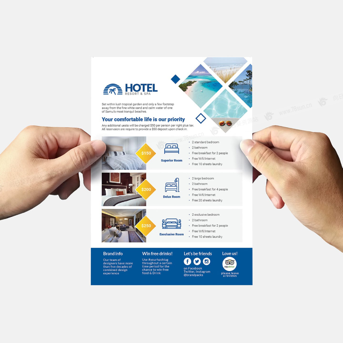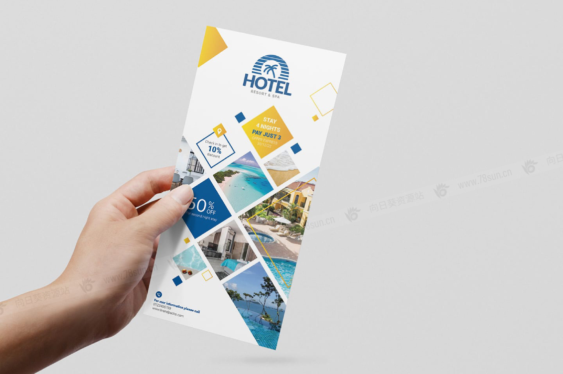 旅行社旅游公司酒店客房服务选项宣传单小册子折页psd ai设计模板,风格和布局非常适合推广客人住宿套餐。包含 2 个 5×7 英寸和 2 个 DL 页面布局,以及一个额外的社交媒体横幅。这种尺寸和布局非常适合传单设计、明信片、半页广告和标准尺寸的餐桌帐篷。