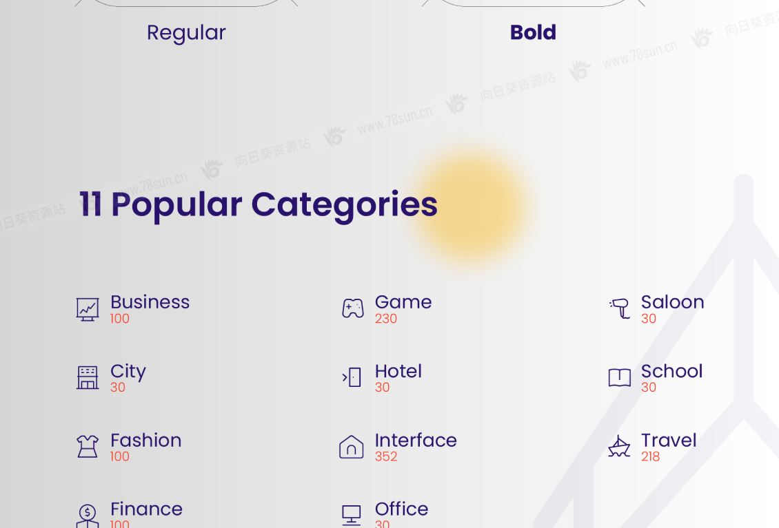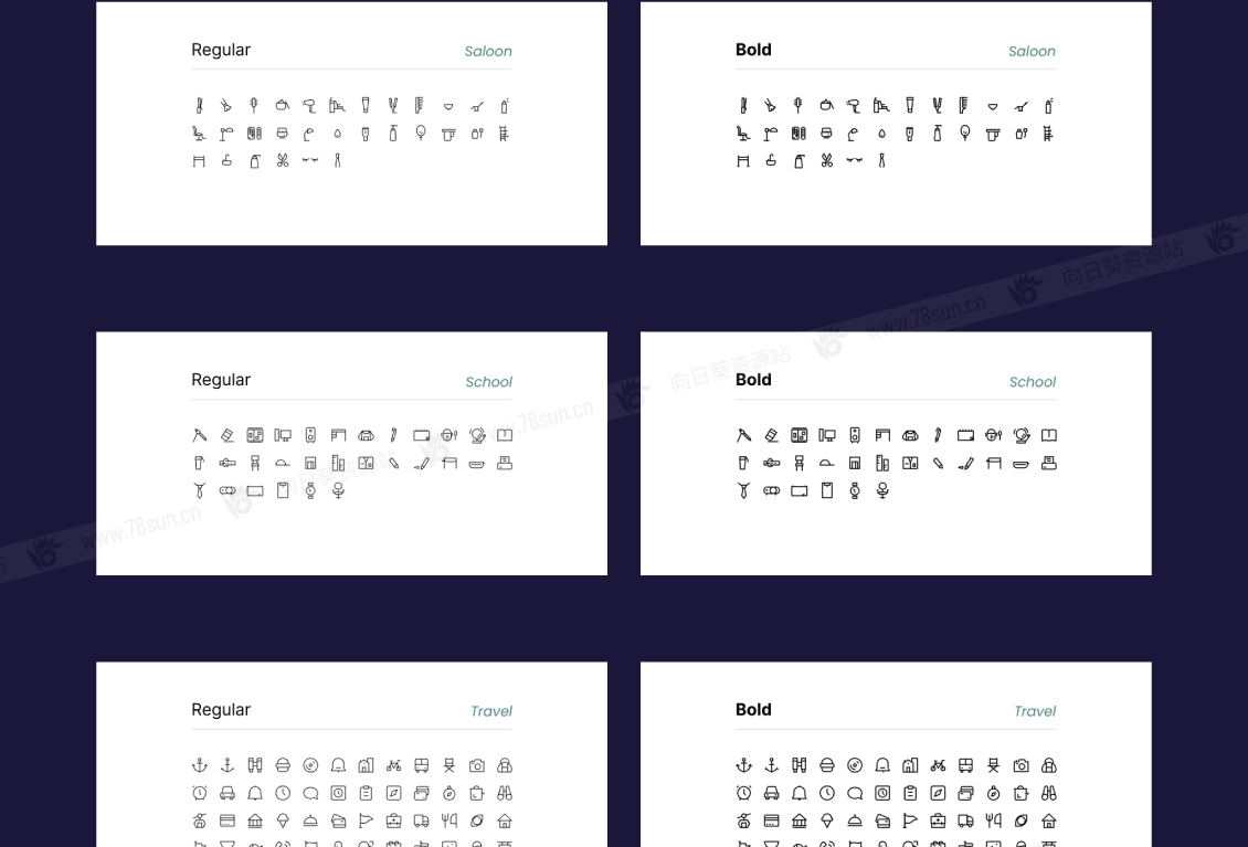 一个由1,200+多个图标组成的库,分为商务、办公、学校、旅行、金融、游戏、酒店等11个不同的类别,使您可以轻松探索和找到您可能正在寻找的字形。随附 Figma 和 Adobe Illustrator 文件,提供 EPS、SVG、PNG 和 PDF 格式。