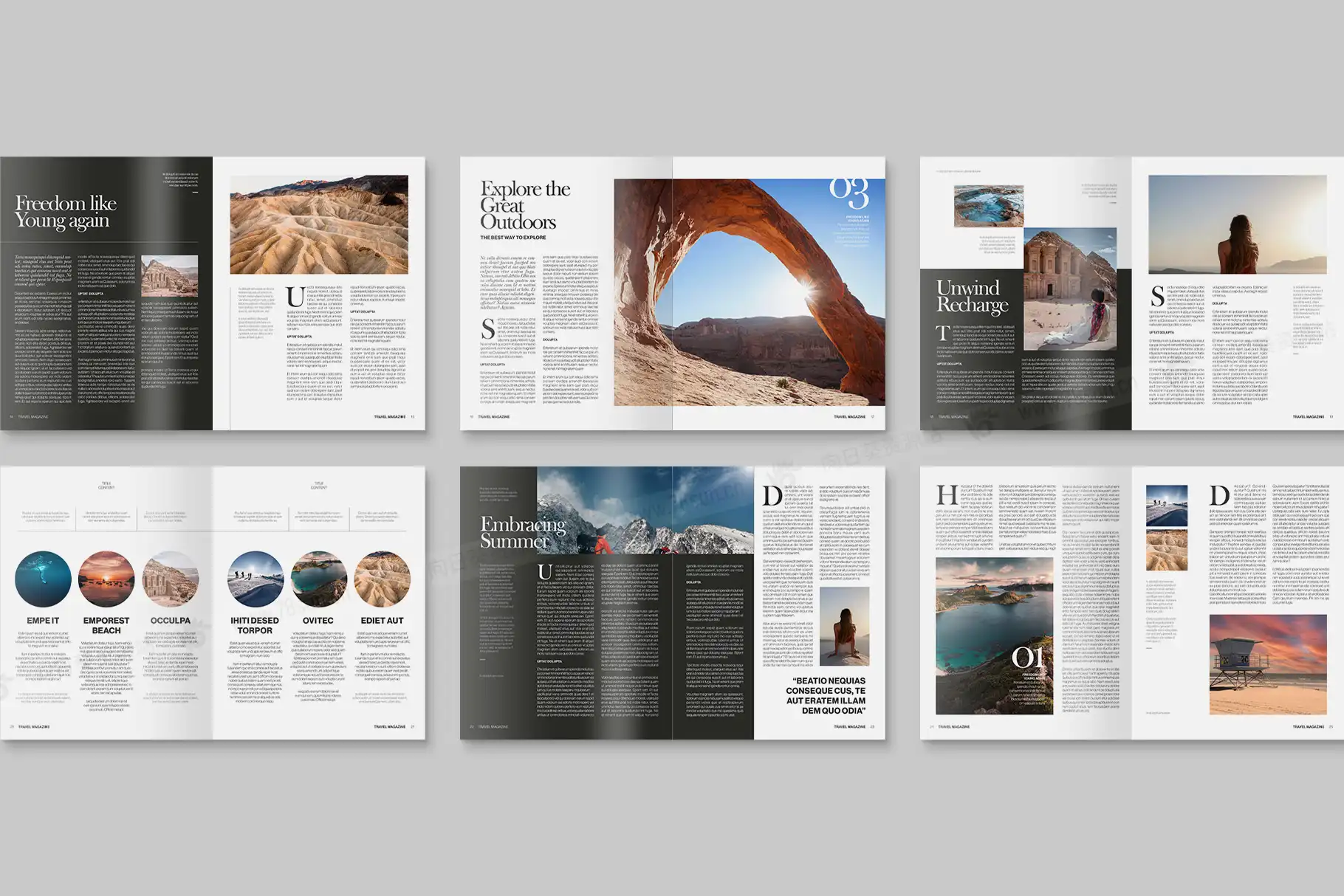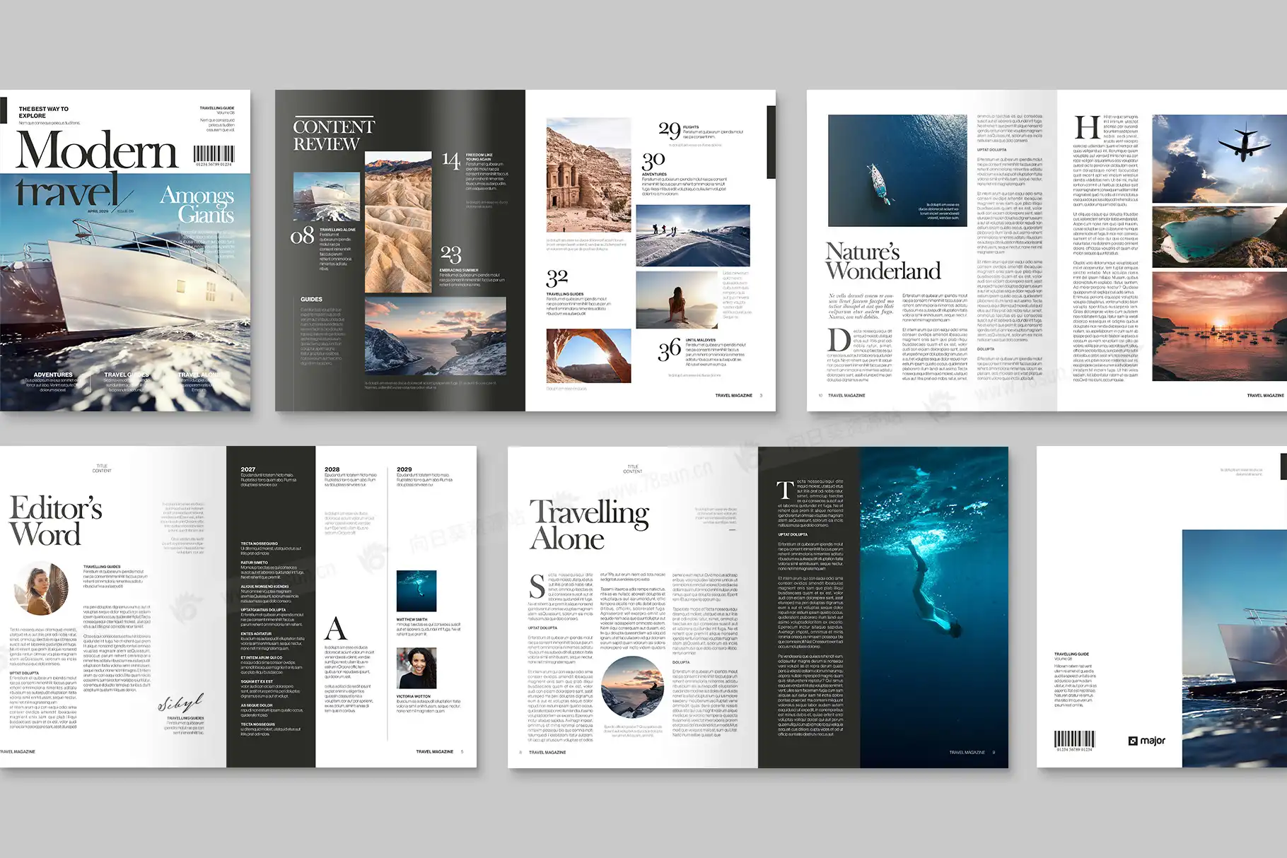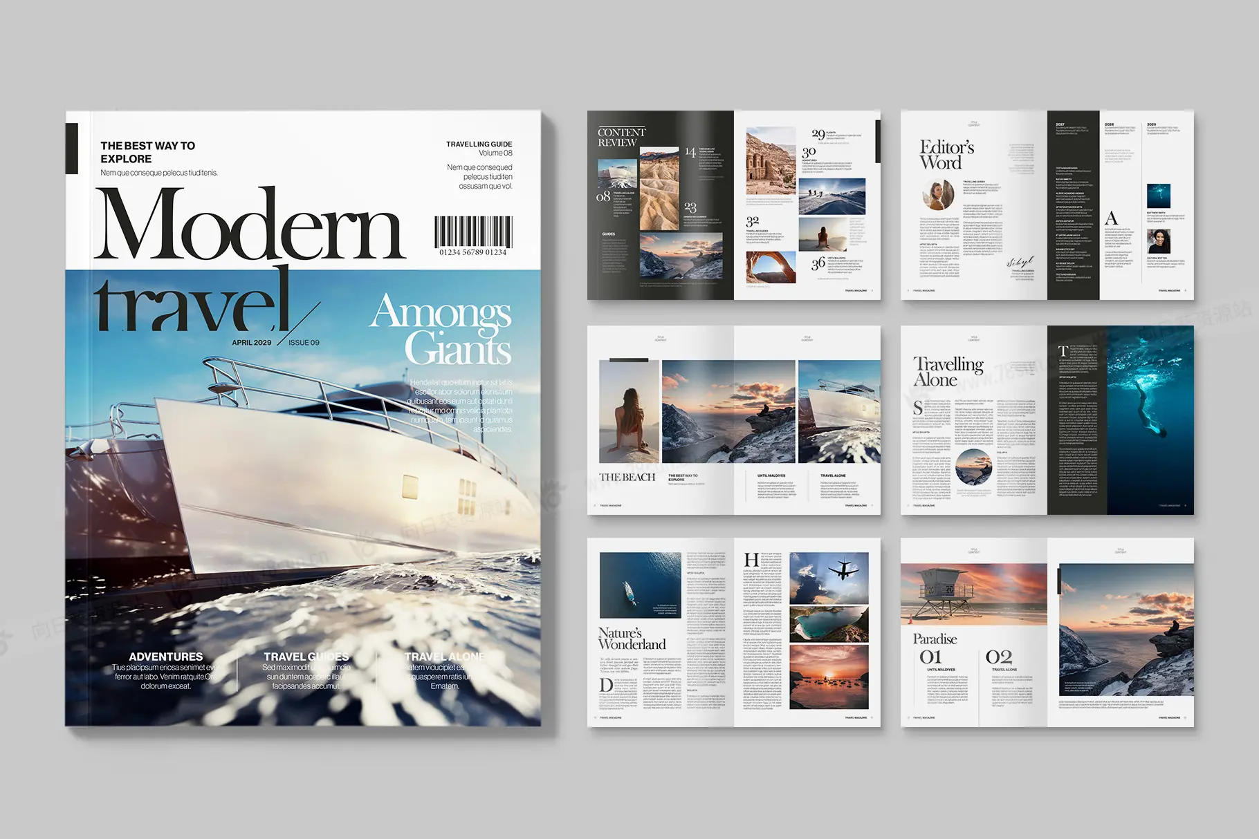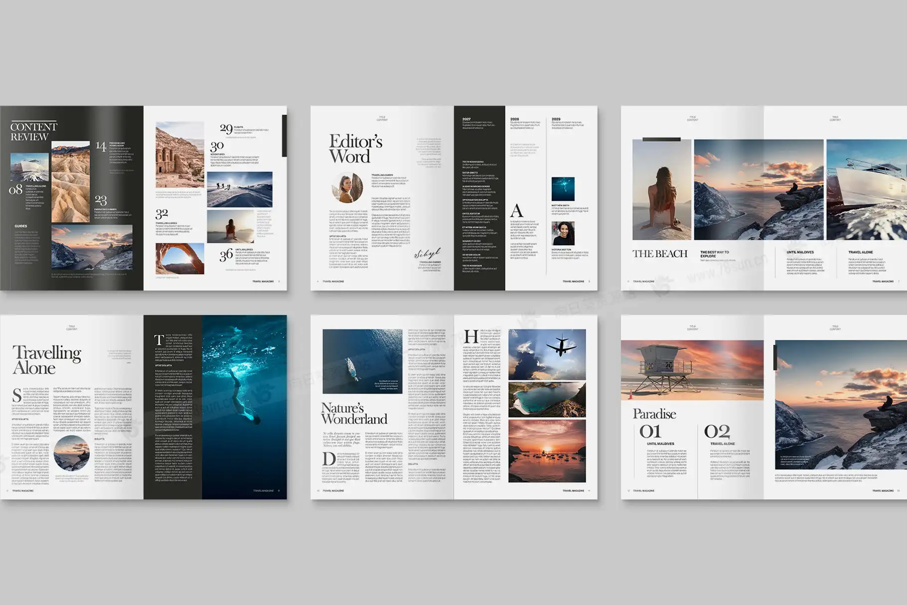 旅游旅行旅游局度假摄影作品集宣传册杂志画册indd设计模板,这款 InDesign INDD 格式模板采用方便的美国信件小报尺寸设计,非常适合希望以时尚、专业的方式展示目的地的旅行社、度假胜地或旅游局。