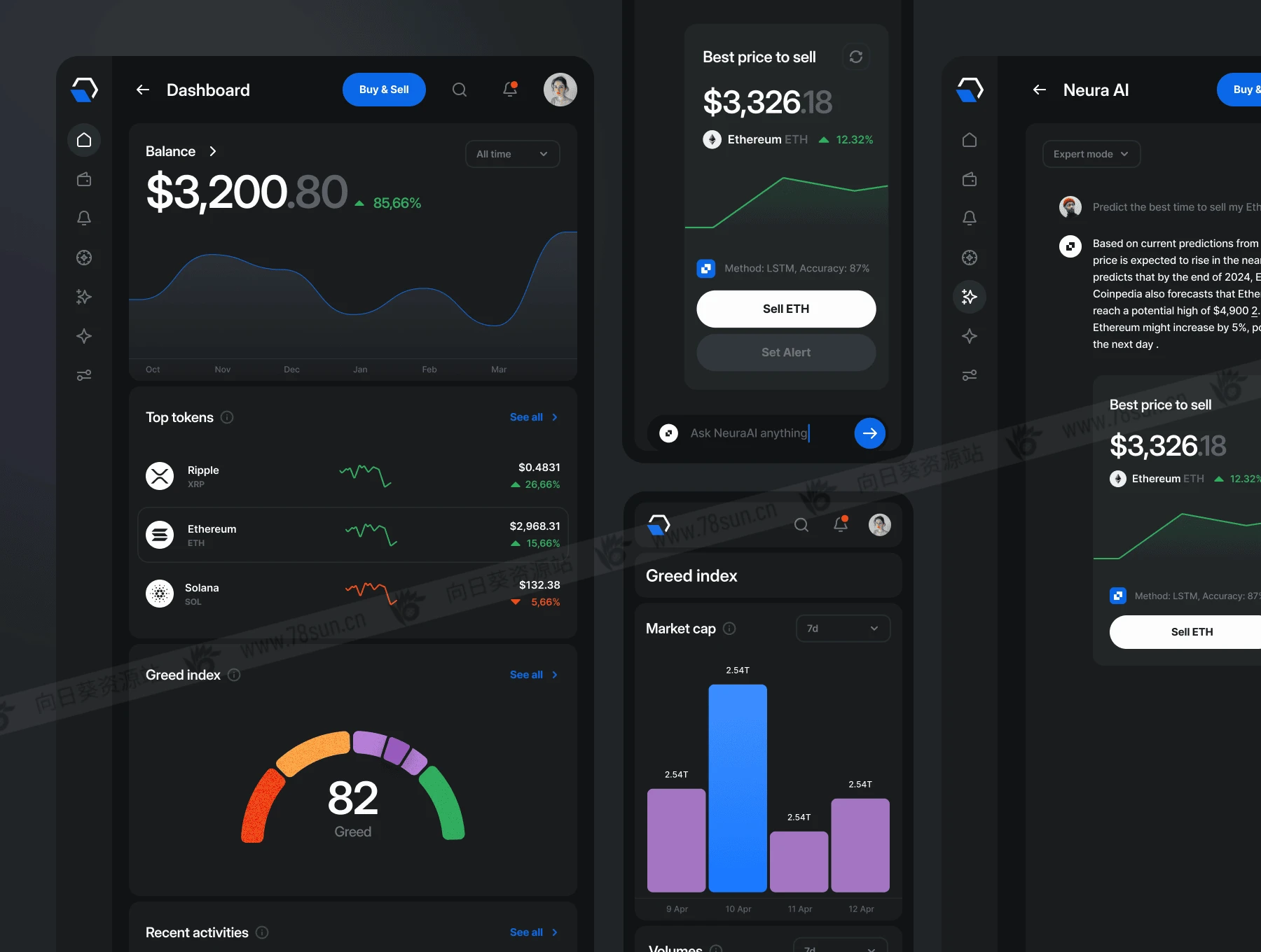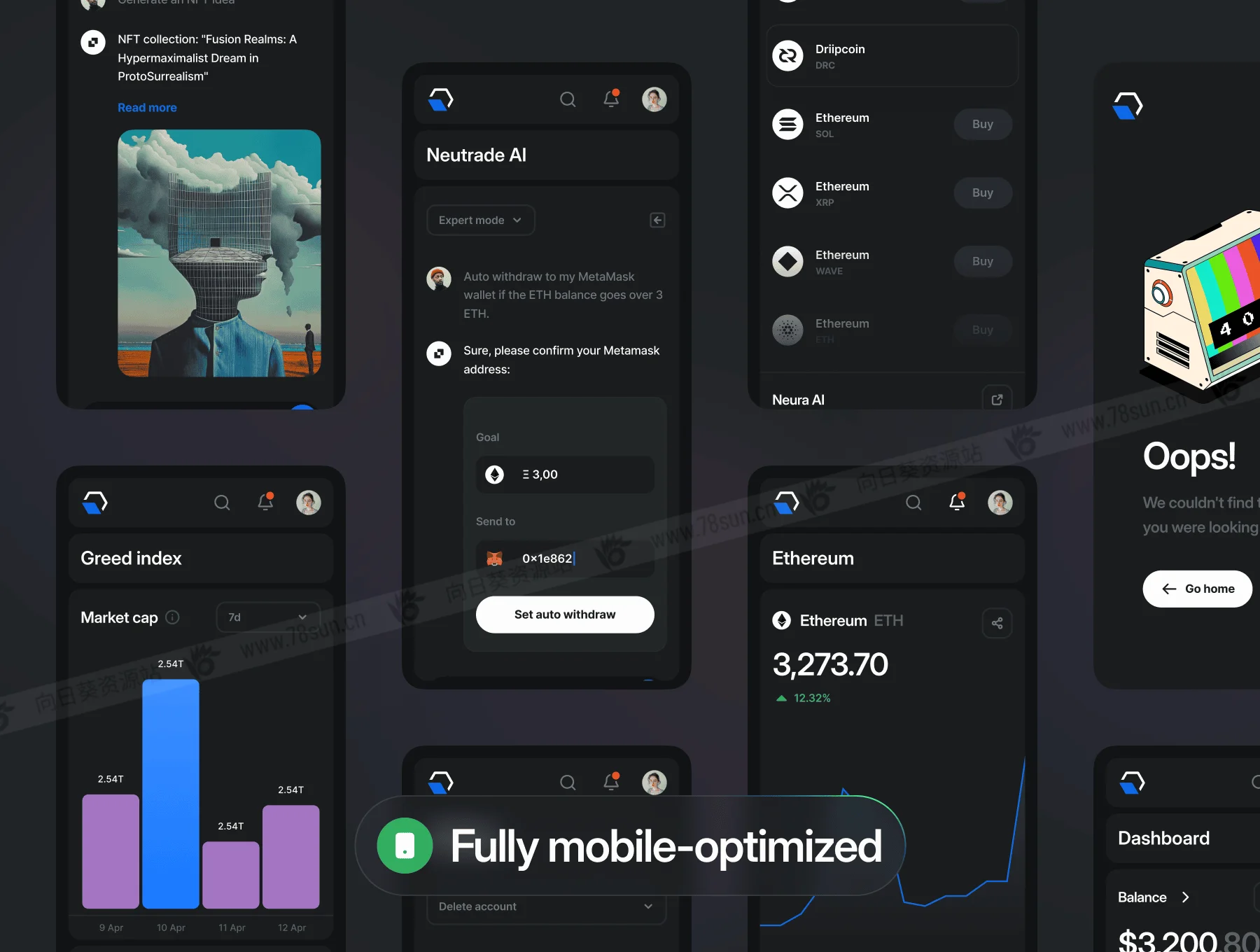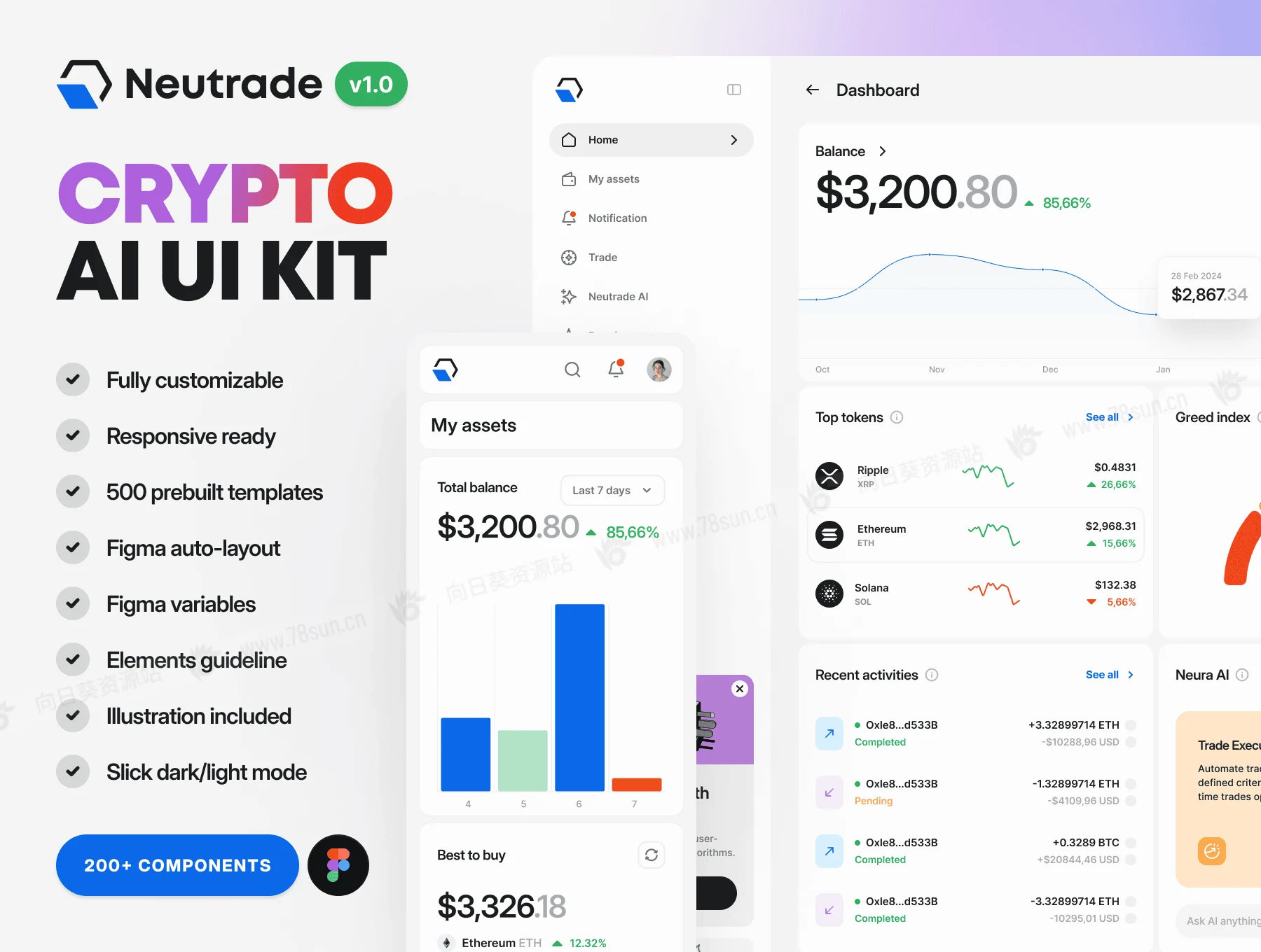 金融加密货币全平台网站移动端web/app ui界面设计fig源文件模板,是一款简洁明了的加密 AI UI 套件,专为您在台式机、平板电脑和移动设备上的所有设计需求而构建。它分浅色和深色模式,具有广泛的美感。包括:仪表板概述、指数、搜索功能、加密资产和详细信息、发送/接收加密、兑现、通知、交易、详细的代币信息、AI 聊天、买卖加密模式、加密转换、、定价选项、设置、帐户登录/上台和最新消息……等,figma格式,共500个界面