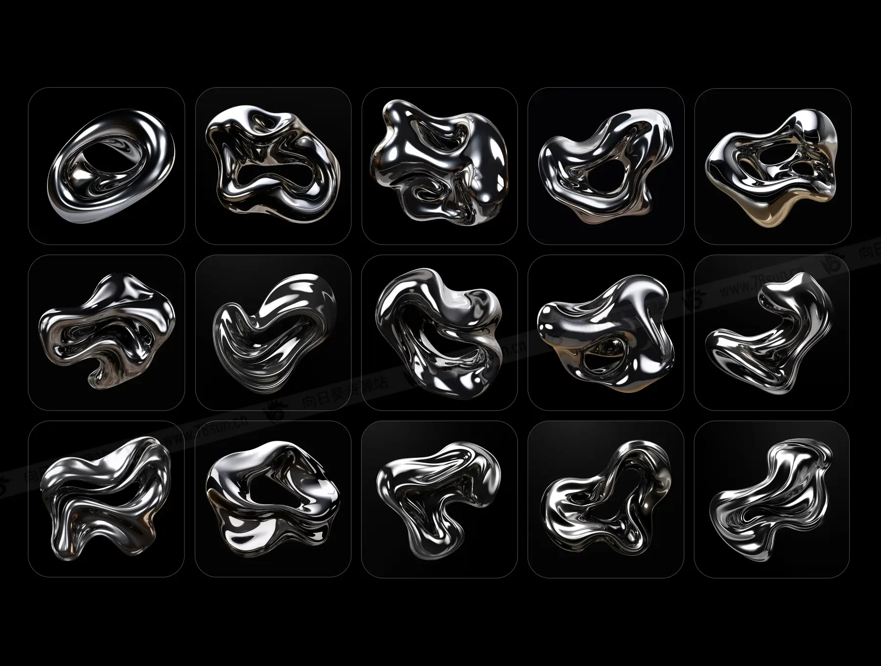 3D立体液态流动铝光泽闪亮金属形状元素fig素材包,铝的光泽和令人着迷的液态金属流动的融合。以 4000×4000 像素制作,提供 PNG 和 JPG 版本