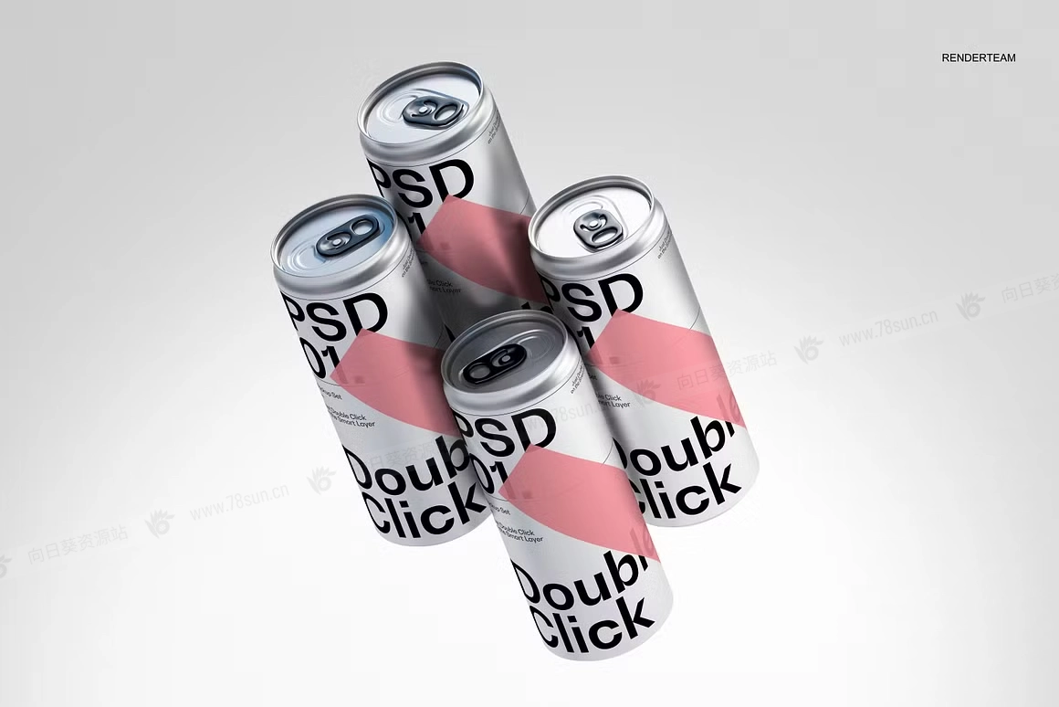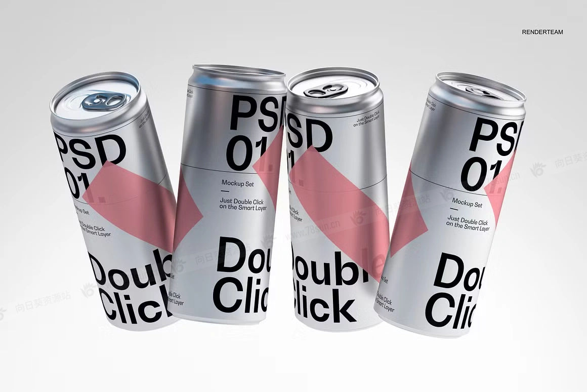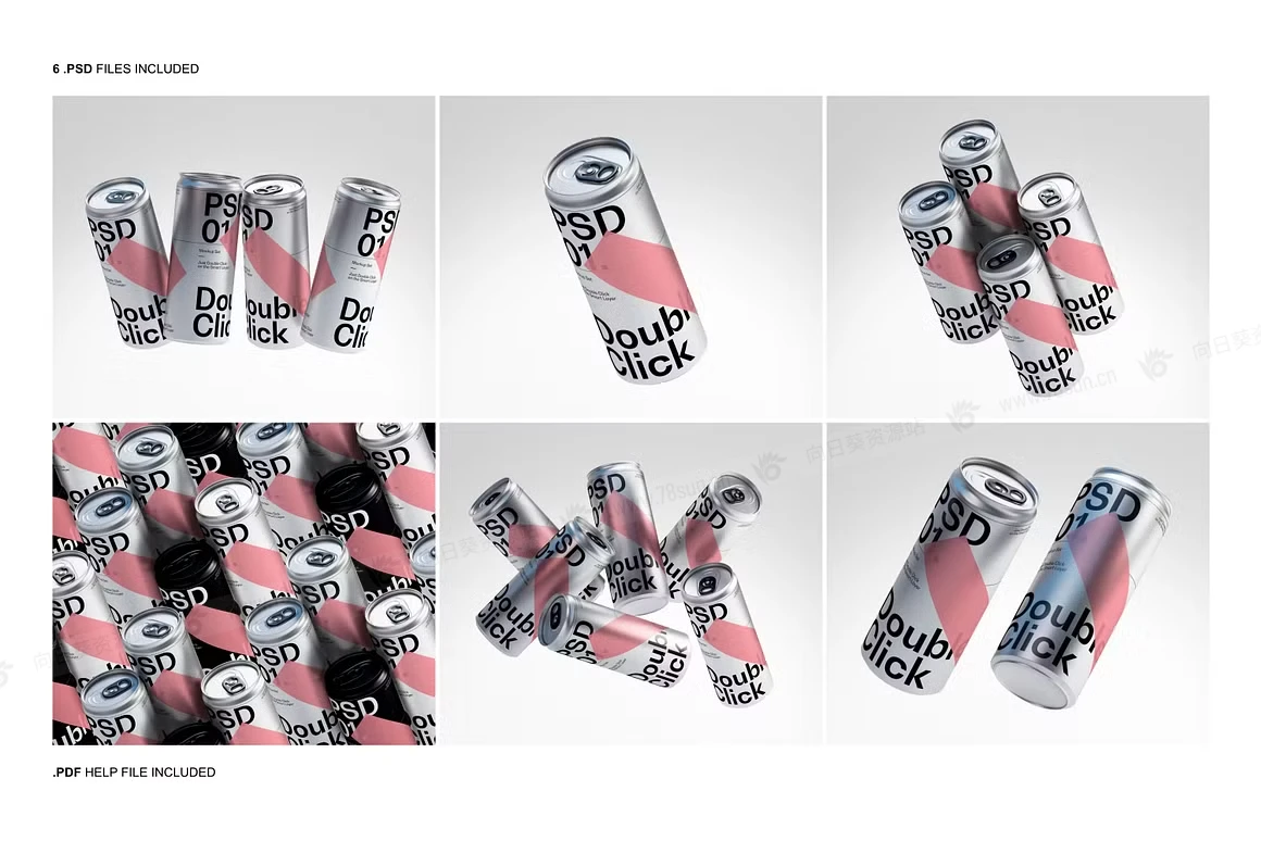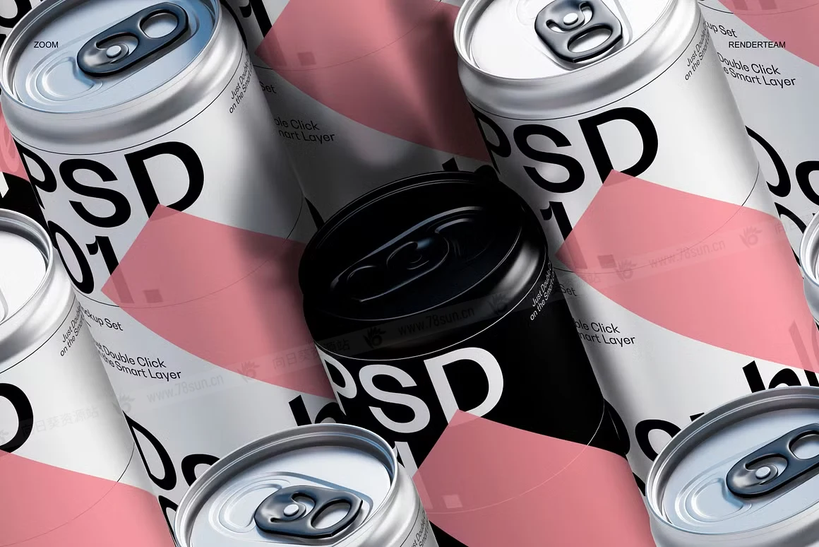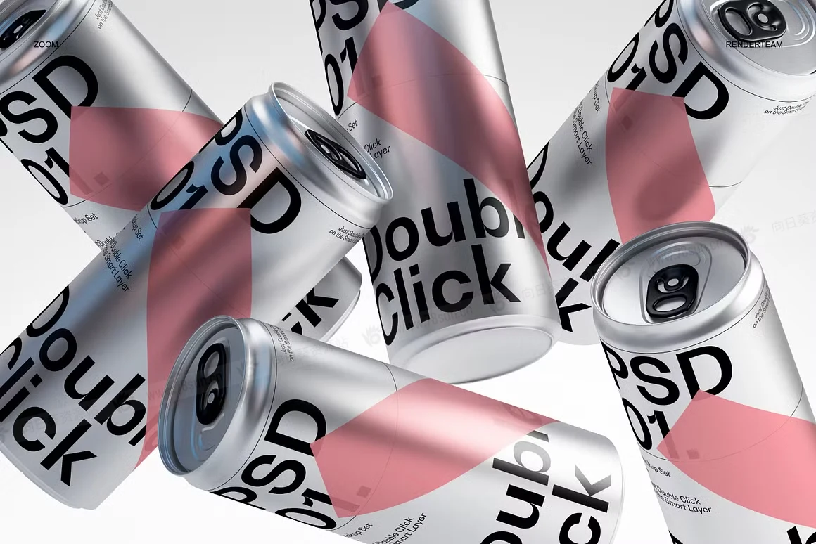 金属汽水罐易拉罐VI设计效果图展示智能贴图psd设计样机套装 – 分层、可编辑的Photoshop文件,通过编辑智能对象和颜色图层来展示您的定制设计。
