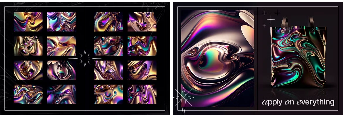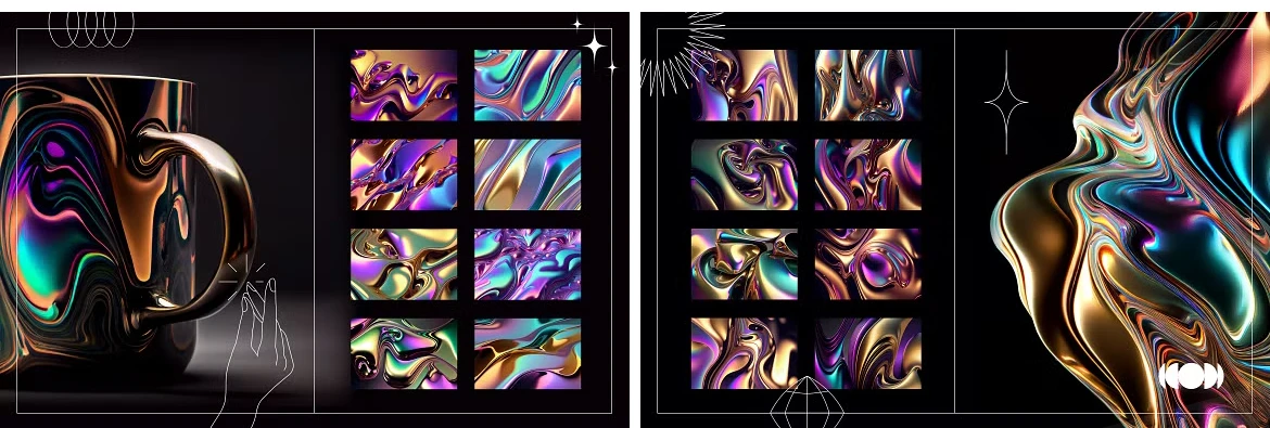 液态炫彩彩虹色金属流动效果图形纹理背景素材包,是数字图形设计元素,可模仿具有虹彩或金属光泽的液态金属外观。这些纹理是使用数字艺术技术的组合创建的。它们可用于各种设计项目,包括网站、徽标、印刷材料和数字媒体等。