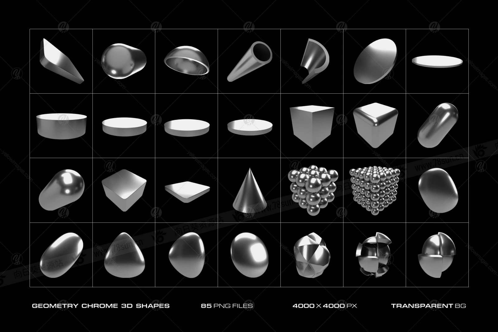 3D立体镀铬金属形状几何图形元素海报背景png素材包, 共85 个高品质元素。非常适合海报、封面、网页设计、社交媒体、包装或任何其他需要大胆时尚设计的创意项目。包含:
