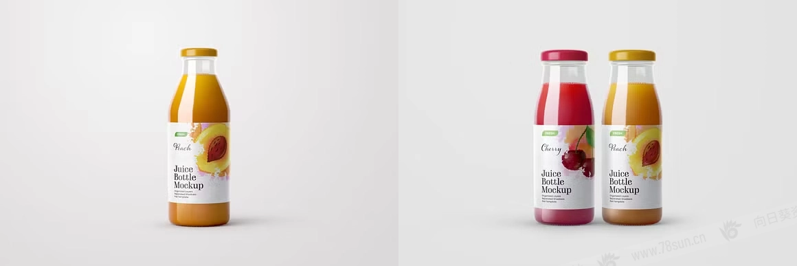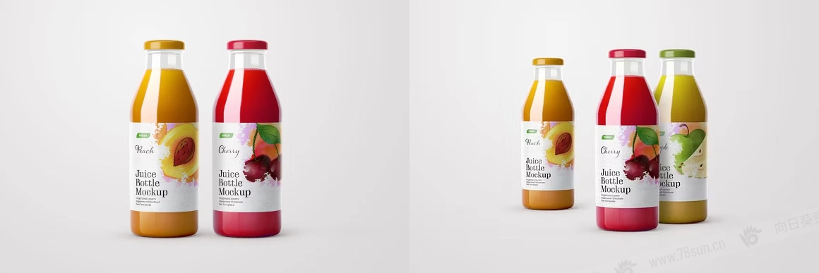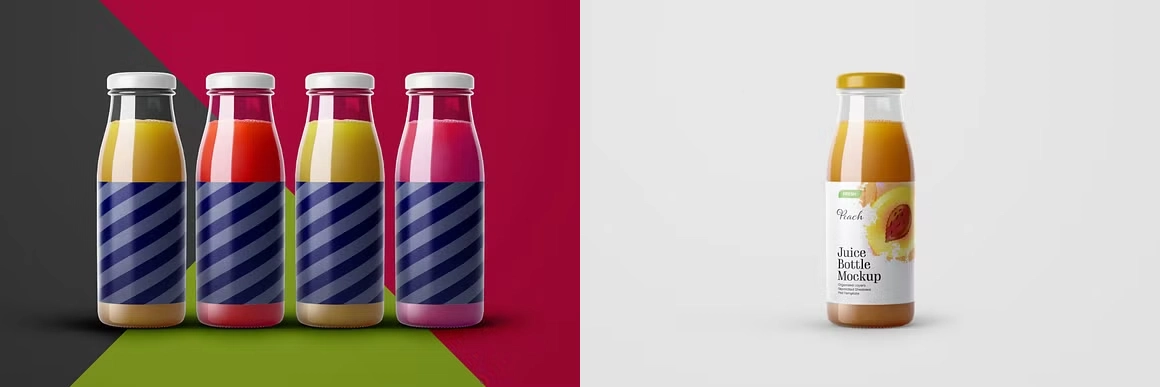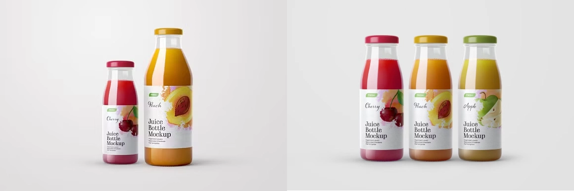 果汁饮料玻璃瓶VI效果图展示智能贴图psd包装设计样机,有 10 个场景、4k 背景和时尚的包装设计。该模型包包括总共 10 个瓶子模型,包括草莓、桃子、樱桃、苹果、葡萄等,可用于食品品牌设计和包装设计。如果你想在瓶子里添加其他果汁,改变果汁的颜色是很容易的。特征