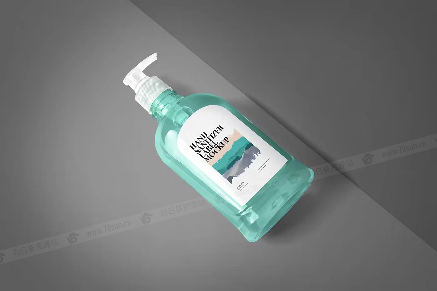 透明洗手液泵瓶塑料瓶品牌VI包装效果图展示智能贴图psd设计样机,