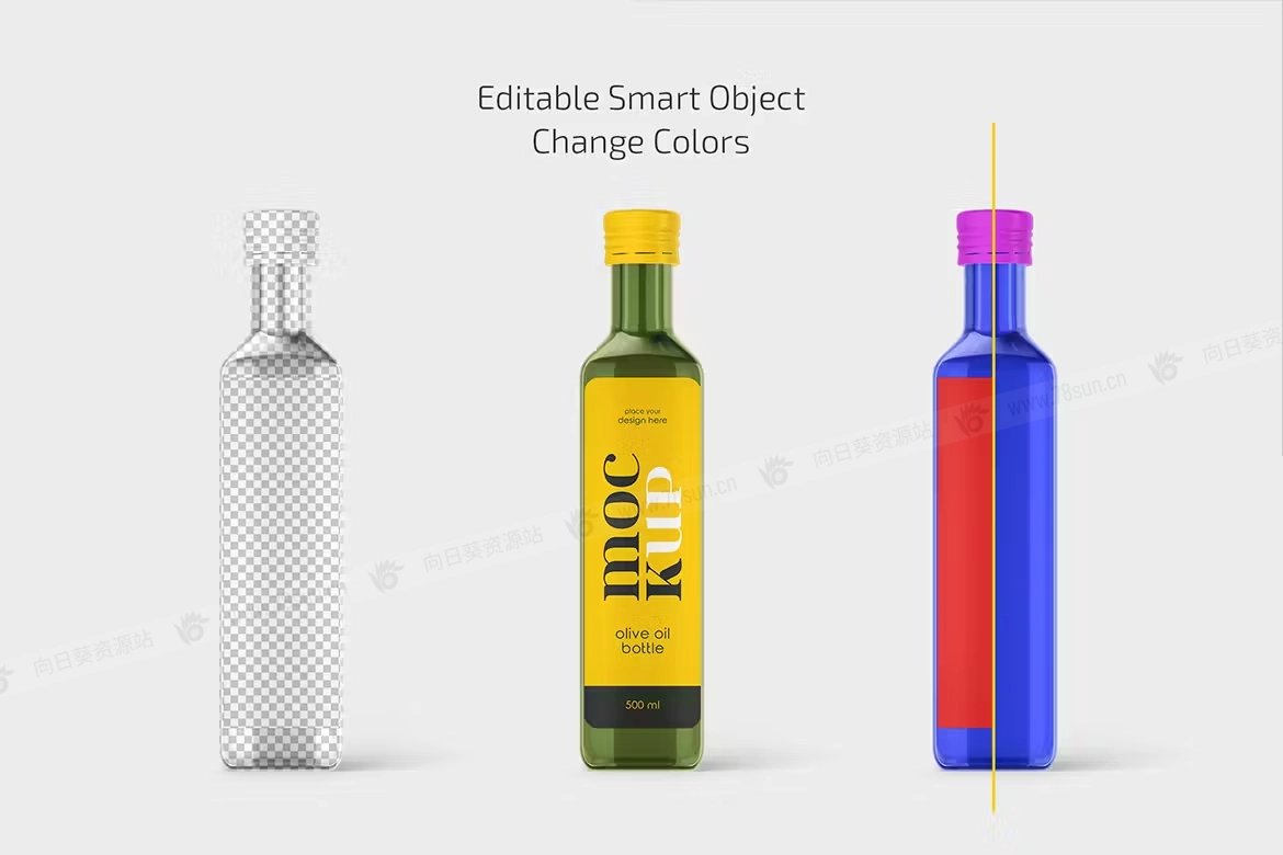 橄榄油玻璃瓶品牌VI效果图展示智能贴图psd设计样机,展示您的徽标、品牌等。毕竟,它们是以高分辨率制作的。智能对象可以节省大量时间。只需在智能对象上单击几次,添加您自己的图形并保存结果。