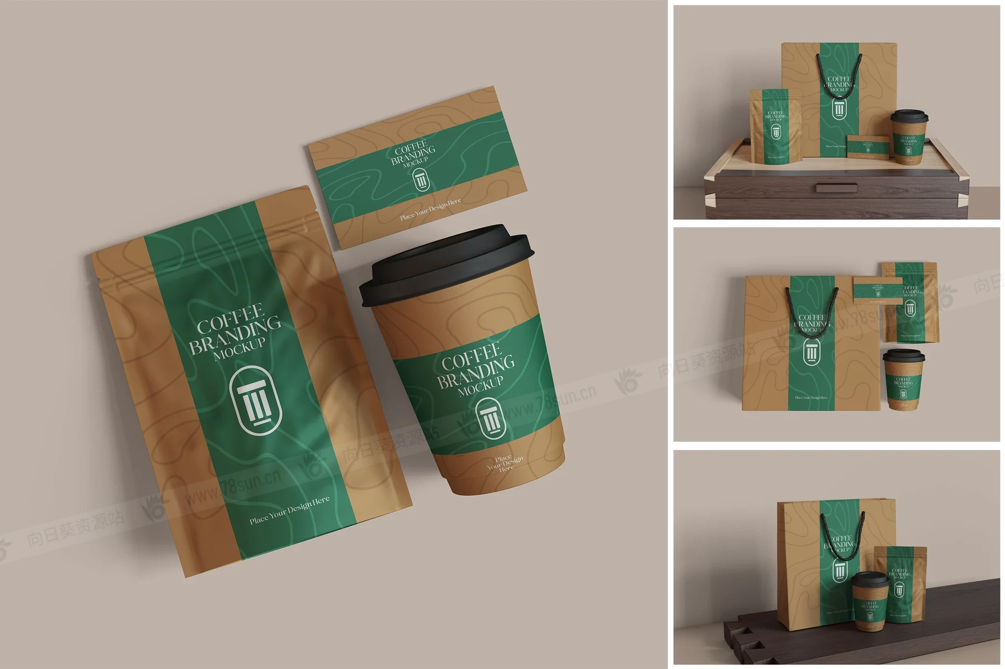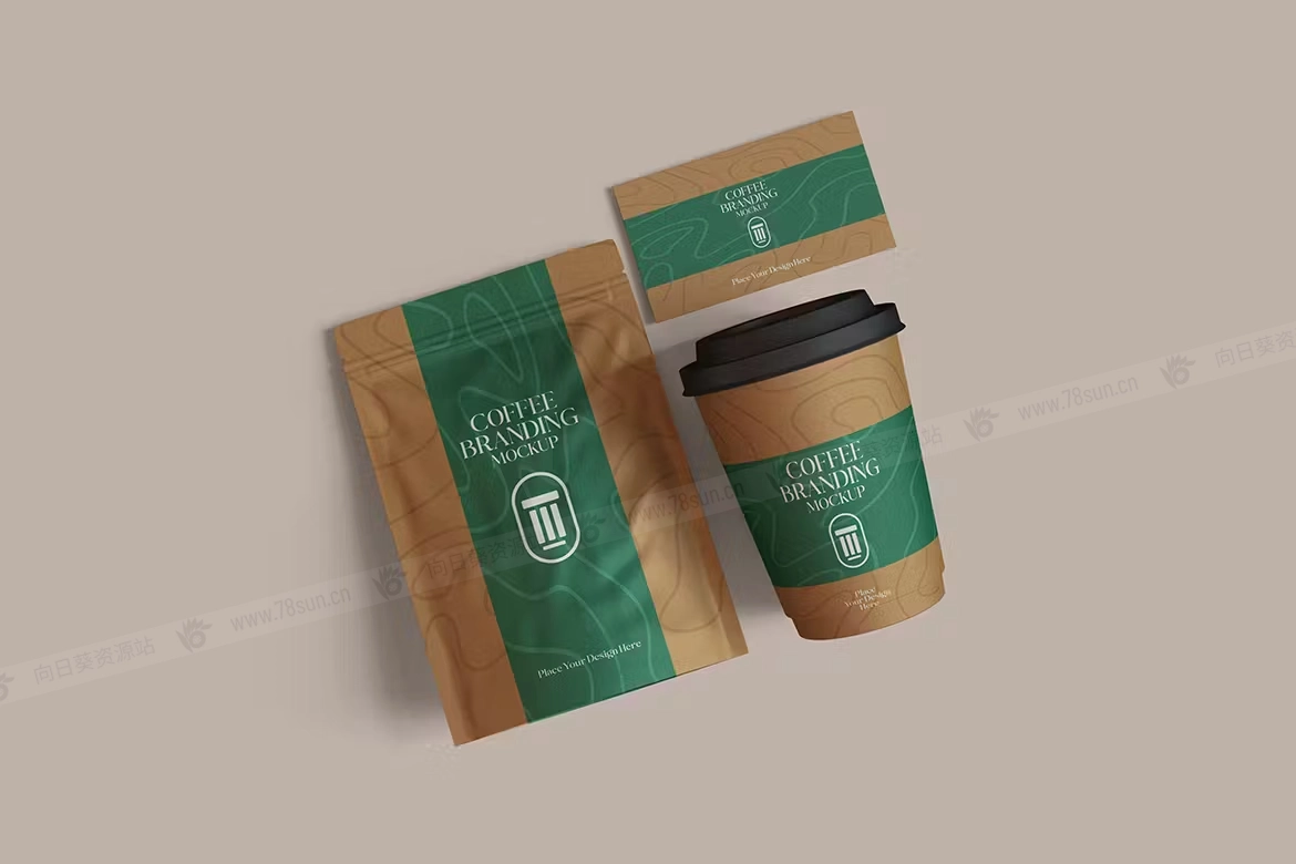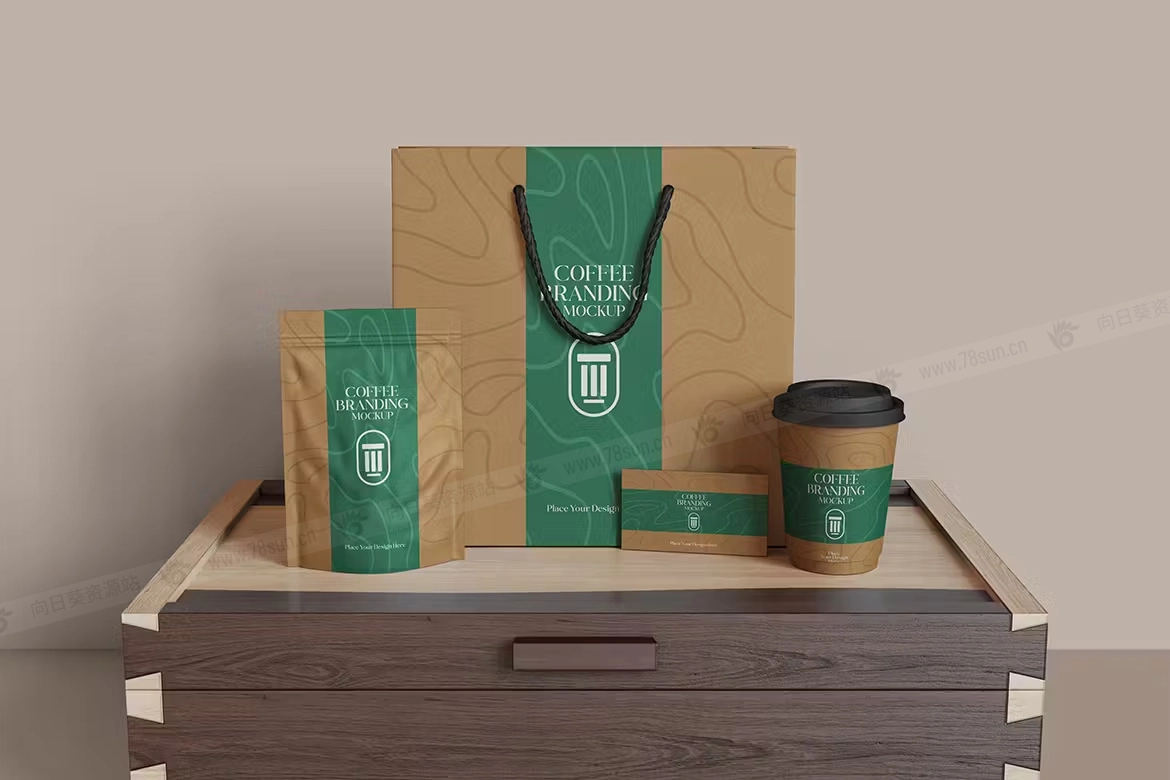 咖啡包装手提袋纸杯名片品牌VI效果图展示智能贴图psd设计样机,使用智能对象轻松替换您的设计,双击智能图层,复制并粘贴您的图稿,保存,您就完成了!