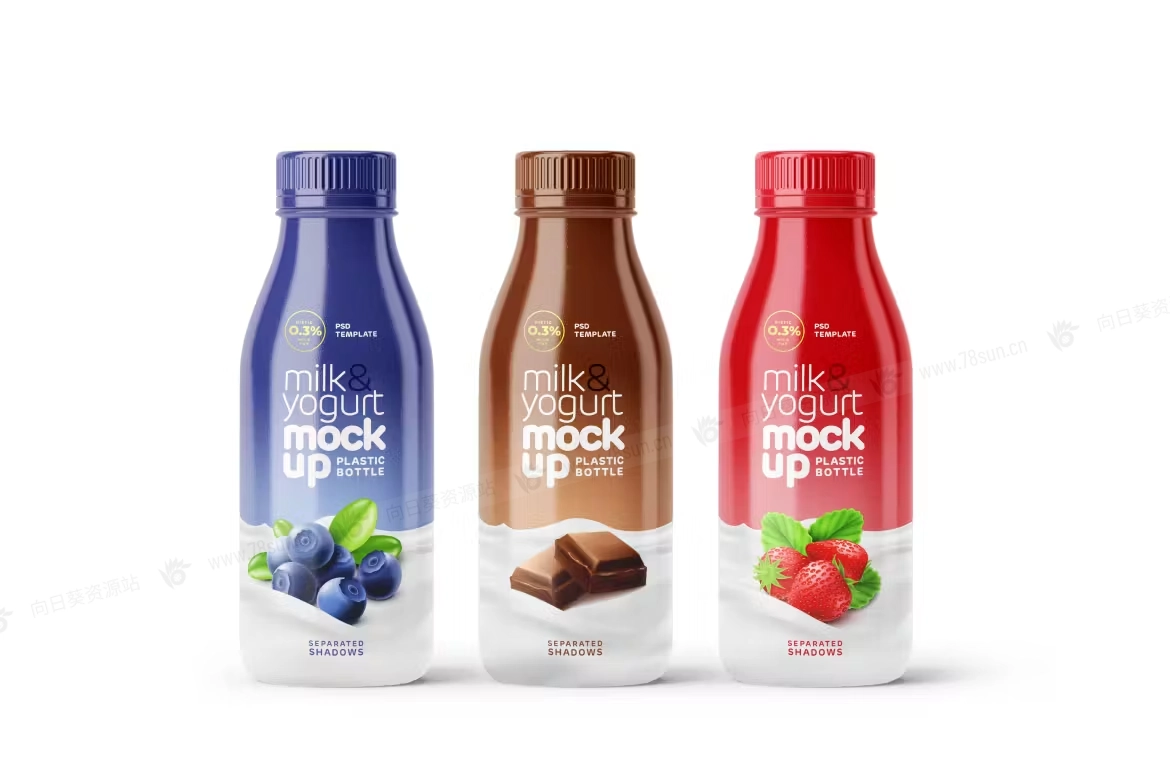 酸奶牛奶塑料瓶品牌VI效果图展示智能贴图psd设计样机,具有 4 个场景、4k 背景和时尚的全身包装设计。该模型包包括总共 4 个牛奶瓶模型,这些模型具有分离的阴影和反射,可用于果味、巧克力、香草、经典牛奶和酸奶包装设计。只需在 PSD 文档中使用智能对象将元素替换为您的设计并保存即可。