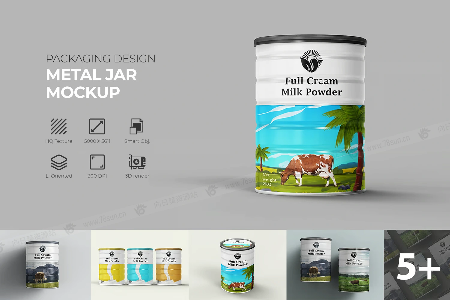 奶粉容器锡罐品牌VI效果图展示智能贴图psd设计样机,该模型拥有 5000 像素 X 3611 像素(300 像素/英寸)的惊人分辨率,保证了卓越的质量和细节。设计层被精心包裹在罐子上,为您自己的设计创造一个平滑无缝的过渡。此外,借助智能对象功能,替换您的设计从未如此简单或方便。