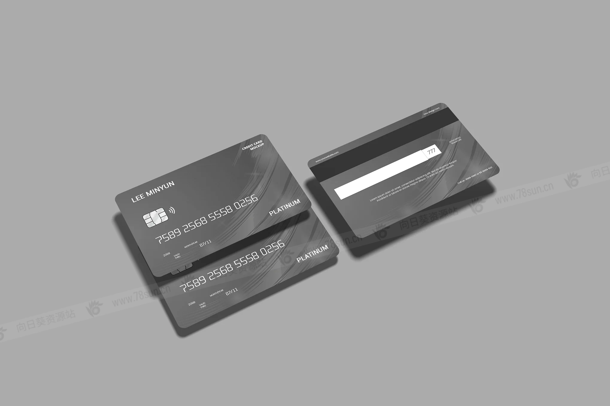 信用卡银行卡VI效果图展示智能贴图psd设计样机,使用智能对象功能轻松快速地替换设计。提供 PSD Photoshop 格式,具有智能对象功能,可帮助您在几秒钟内用自己的设计替换当前设计。