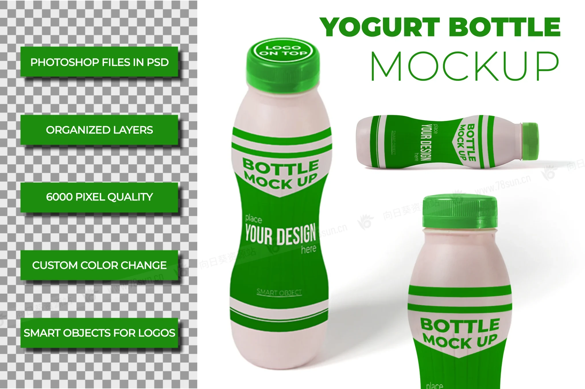 此项目包括 4 个多用途光泽酸奶瓶模型,以专业地展示您的设计。提供 PSD Photoshop 格式,具有智能对象功能,可帮助您在几秒钟内将当前设计替换为自己的设计。