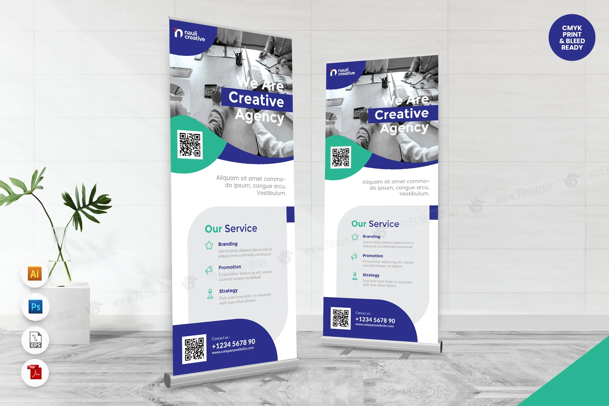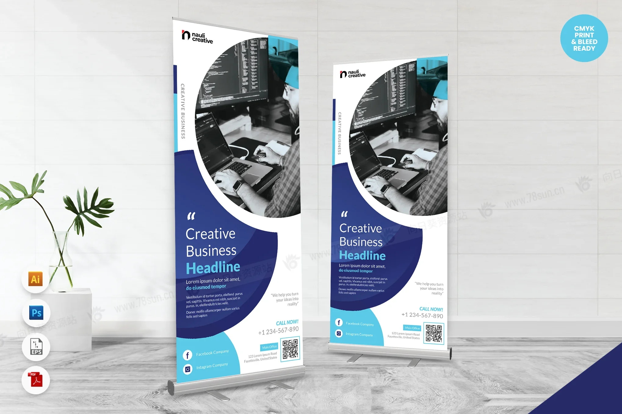商务企业公司市场营销活动宣传展架易拉宝psd ai设计模板,是 100% 矢量的,您可以将文件调整为任意大小,而不会降低其质量。使用 Adobe Illustrator 和 Adob e Photoshop 软件编辑内容也很容易。