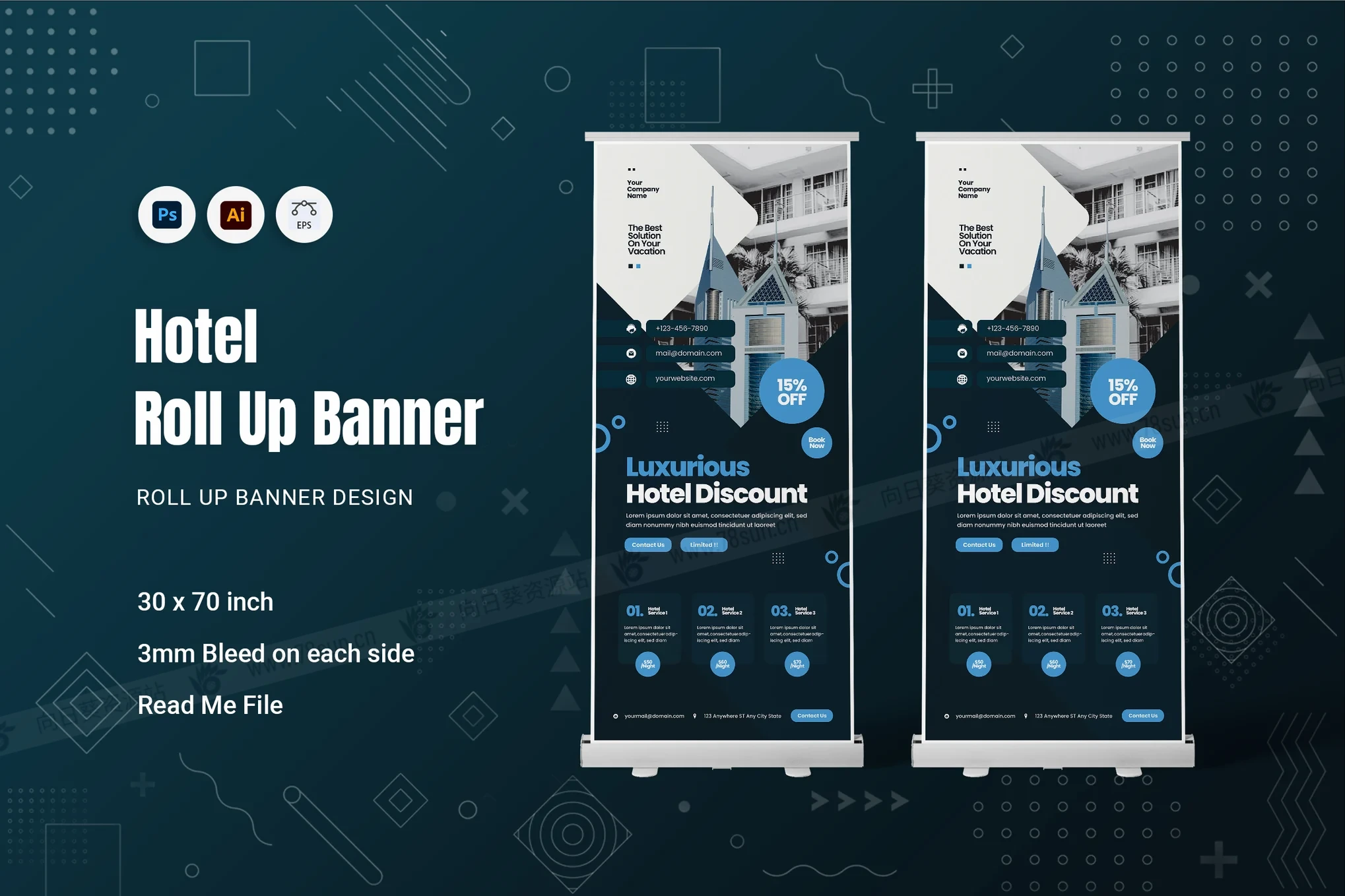 酒店民宿公司企业宣传活动展架易拉宝psd ai设计模板。它非常适合活动和展览,展示您的品牌或促销活动。使用您自己的文本和图像进行自定义,以获得个性化风格。