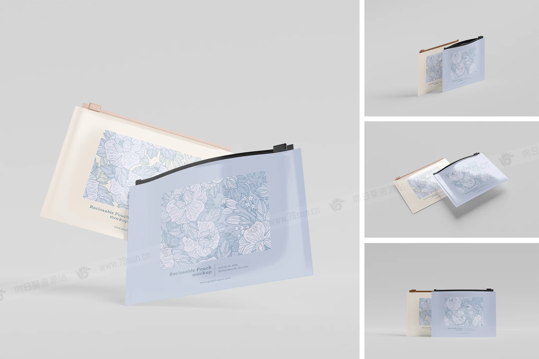 可重复拉链封口塑料袋品牌VI效果图展示智能贴图psd设计样机,由 4 个不同的可重复封闭袋模型组成,以逼真的外观展示您的设计。这些模型文件使用智能对象功能,可帮助您在几秒钟内更改设计(包括 PDF 说明)。