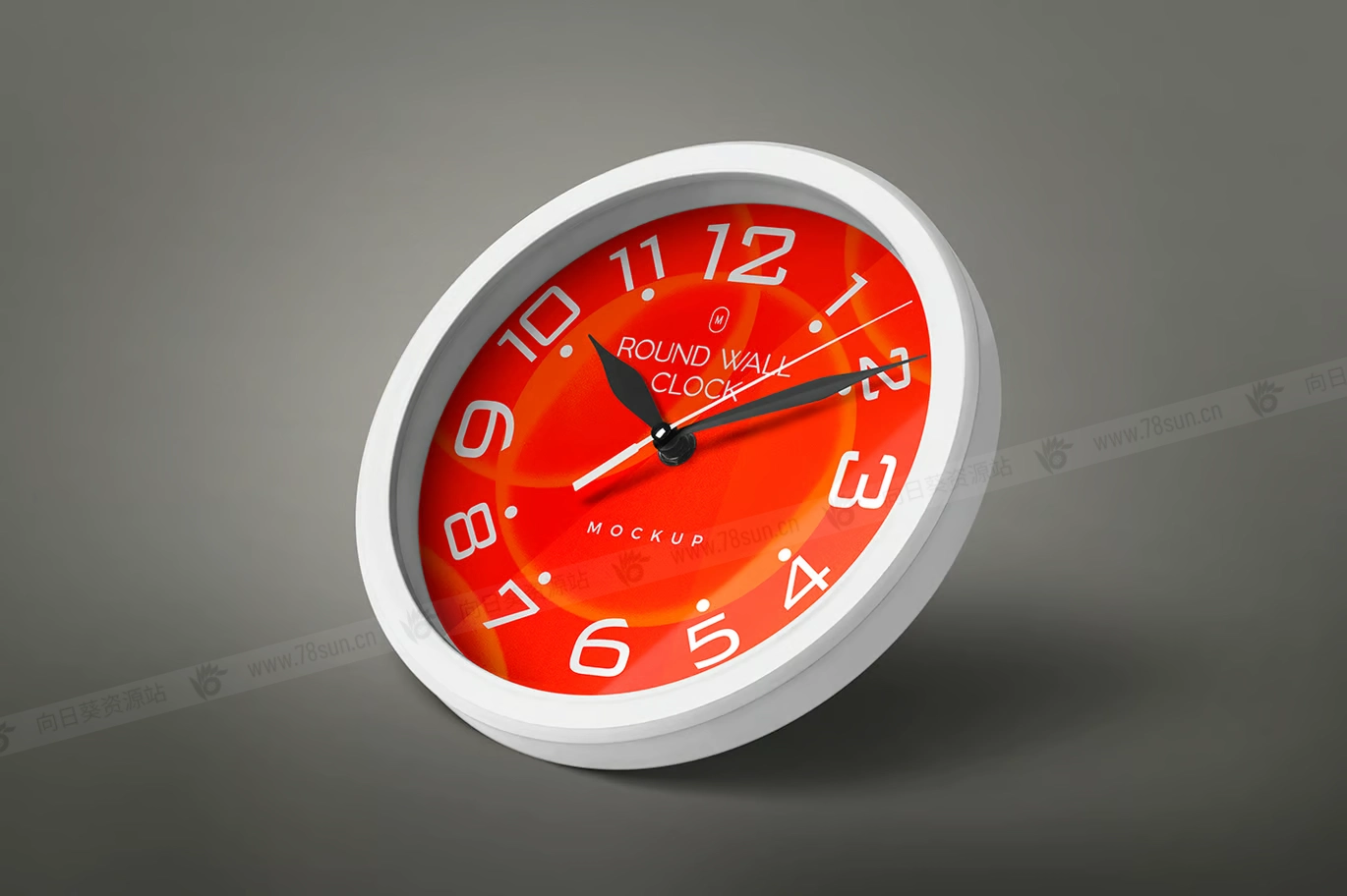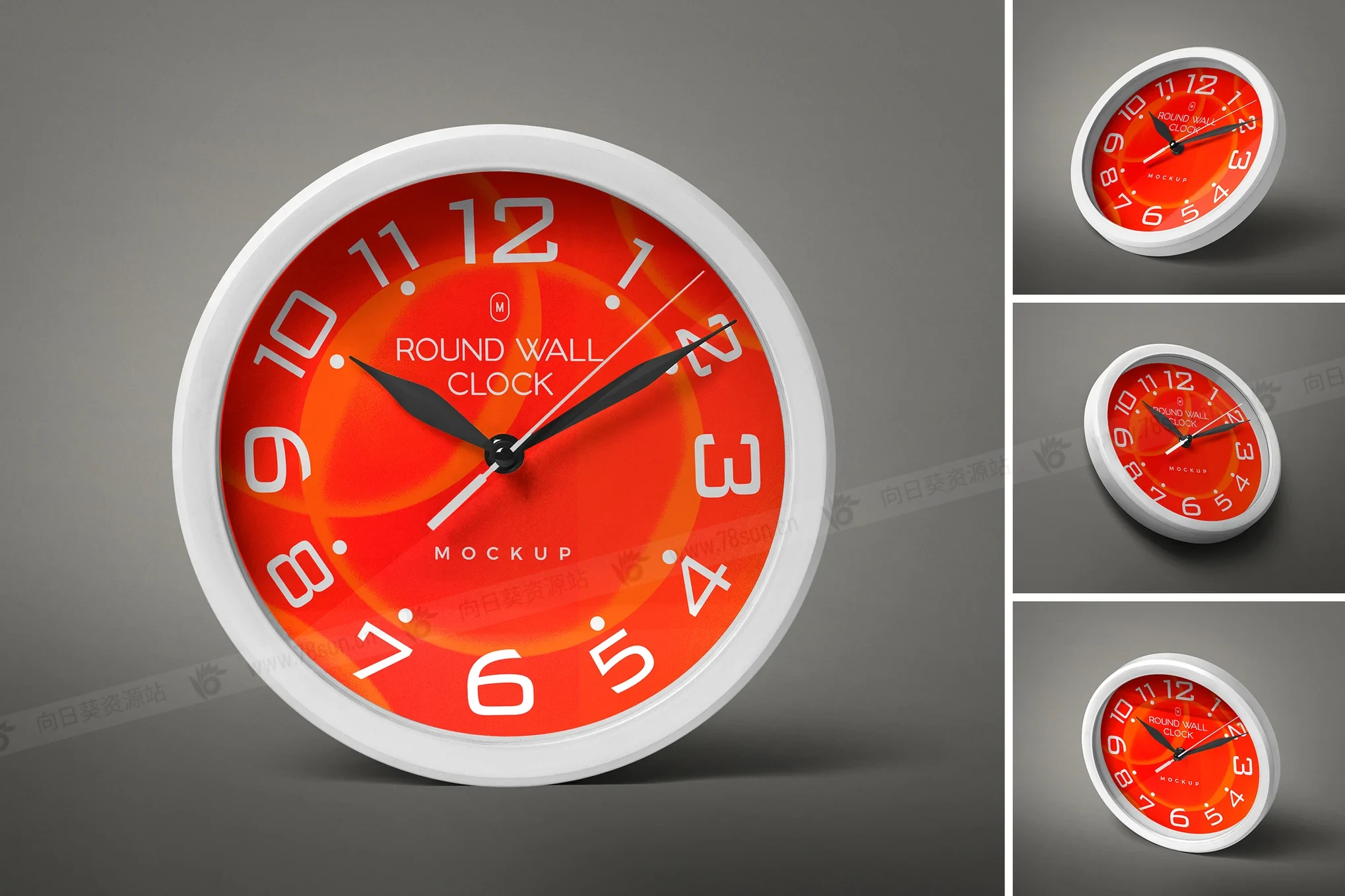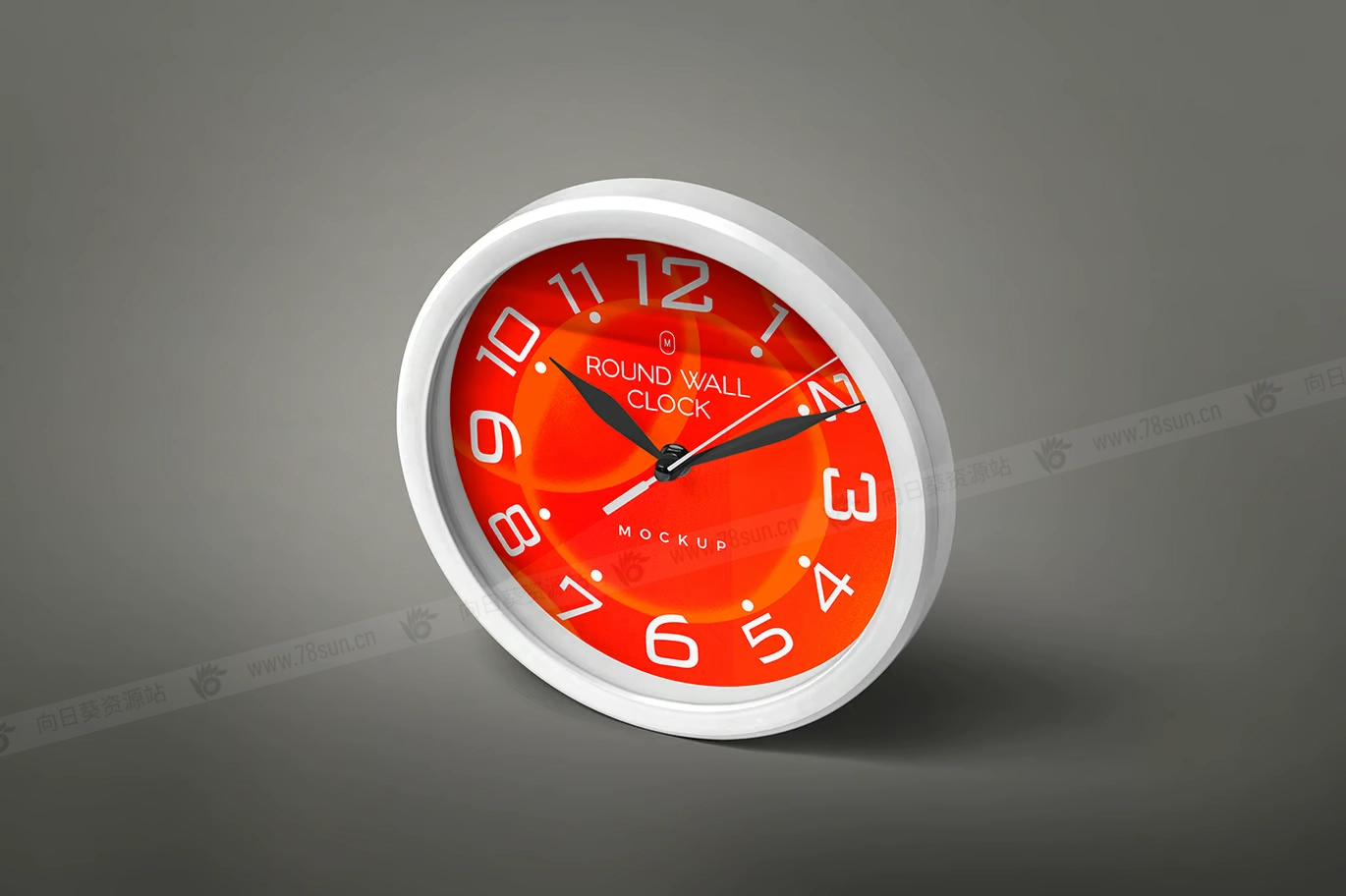 圆形墙钟时钟品牌VI效果图展示智能贴图psd设计样机,提供了一个真实的视图,展示了您的设计在物理形式下的外观,增强了视觉冲击力和对客户的吸引力。